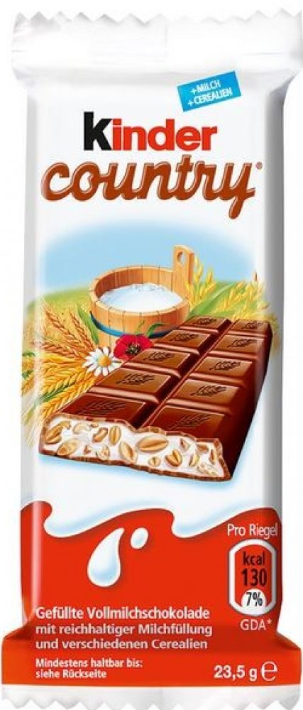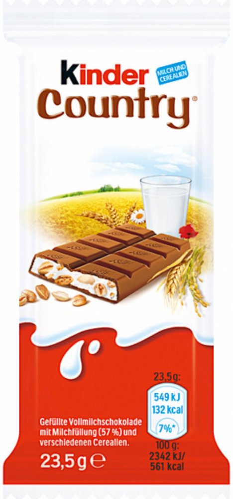 Podrobný popisMléčná čokoládas mléčnou náplní (59 %) aCereáliemiParametry výrobkuTypmléčná Příchuť: mléčná Čistý obsah: 23,5 g Země původu/místo výroby: Polsko Počet spotřebitelských balení: 15360 ks. Počet balení v první řadě na paletě: 384 spotřebitelských balení (DU) Výška palety: 1,47 m Hrubá hmotnost: 1,04 kg Kód KN: 1806 31 00 Velikost balení (ŠxŠxG ): 5 x 11 x 1 cm Počet vrstev na paletě: 12 vrstev Skladovací teplota min - max: 14 - 18 °C Složení: (cukr, kakaový tuk, sušené plnotučné mléko, kakaová dřeň, emulgátor: lecitiny (sója); vanilin), cukr, sušené odstředěné mléko (17,5 %), palmový olej, expandovaná obilná zrna 7,5 % (ječmen, rýže, pšenice, pšenice (špalda), pohanka), sušené máslo, emulgátor: lecitiny (sója); vanilin. Hrubá hmotnost na jednotku: 0,03 kg Počet prvních balení v jedné vrstvě palety: 32 balení (DU) Alergenykrustya výrobky z nich: Ne Oxid siřičitý a siřičitany: Ne Sója a výrobky z ní: Může obsahovat Měkkýši a výrobky z nich: Ne Vejce a výrobky z nich: Ne Pšenice a výrobky z ní: Ano Ořechy: Ne: Ne Obiloviny obsahující lepek: Může obsahovat Mléko apříbuzné výrobky (včetně laktózy ): Může obsahovat Ječmen avýrobky z ječmene: Ano Sezamová semínka a výrobky z nich: Ne Rybya výrobky z nich: Ne Hořčice a výrobky z ní: Ne Lupina a výrobky z ní: Ne Celer a výrobky z něj: Ne SkladováníSkladování: Skladujte při pokojové teplotě Výživová hodnotaObsah sacharidův jedné porci (cukr ): 11,5 g Energetická hodnota kcal na porci (energie ): 132 kcal Obsah sacharidů v jedné porci: 12,9 g Energetická hodnota kcal (energie) na deklarovanou jednotku: 561 kcal/100 g Energetická hodnota kJ na porci (energie): 549 kJ Obsah sacharidů (cukru) v deklarované jednotce (g): 49,1 g Obsah tuku v jedné porci (nasycené mastné kyseliny):: 5,1 g Jednotka přepočítacího základu: g/100 g Obsah bílkovin v jedné porci (celkem): 2 g Obsah soli (celkem) v deklarované jednotce (g nebo ml ): 0,28 g Obsah tuku (celkem) na uvedenou jednotku (g ): 33,8 g Obsah tuku na porci (celkem): 7,9 g Velikost porce: 23,5 g Obsah tuku (nasycené mastné kyseliny) v uvedené jednotce (g ): 21,9 g Obsah soli v porci (celkem): 0,07 g Další informace-: 801 550 550 Internetová adresa-: Http:// - ferrero -. Tyčinka Ferrero Kinder Country z pražených obilovin 23gPět lahodných pražených obilovin - ječmen, rýže, pšenice, špalda a pohanka - v mléčné náplni zalité mléčnou čokoládou činí z tyčinky Kinder Country chuťový zážitek. Díky jedinečné čokoládové příchuti je nejen křupavá, ale také krémová a lahodná. Ferrero Deutschland GmbH Hainer Weg 120 60599 Frankfurt nad Mohanem (D)