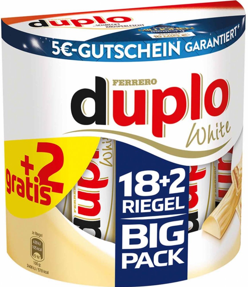 DUPLO WHITEOplatka (7 ) s polevou z bílé čokolády a lískooříškovou náplní (17 ).SLOŽENÍBílá čokoláda 74,5 (kakaové máslo, odtučněné sušené MLÉKO, cukr, MÁSELNÝ tuk, emulgátor: lecitiny (SÓJOVÉ); vanilin), cukr, PŠENIČNÁ mouka,LÍSKOVÉOŘÍŠKY (4), palmový olej, sušená syrovátka (z MLÉKA), syrovátkové bílkoviny v koncentrovaném prášku (zMLÉKA), PŠENIČNÝ škrob, emulgátor: lecitiny (SÓJOVÉ), kakaový prášek se sníženým obsahem tuku, jedlá sůl, kypřící látky (uhličitan amonný, hydrogenuhličitan sodný), vanilin.Může obsahovat MANDLE.Výživové Údajena 100 gEnergetická hodnota(kJ / kcal)2408 / 578Tuky(g)38z toho nasycené mastné kyseliny(g)22,9Sacharidy(g)49,3z toho cukry(g)43,8Bílkoviny(g)9,2Sůl(g)0,305ADRESA :Ferrero D-60624FRANFURKT AM MAIN,Importer do Německa:FERRERO HANDESGES M.B.H. - A-6020 INSBRUCK