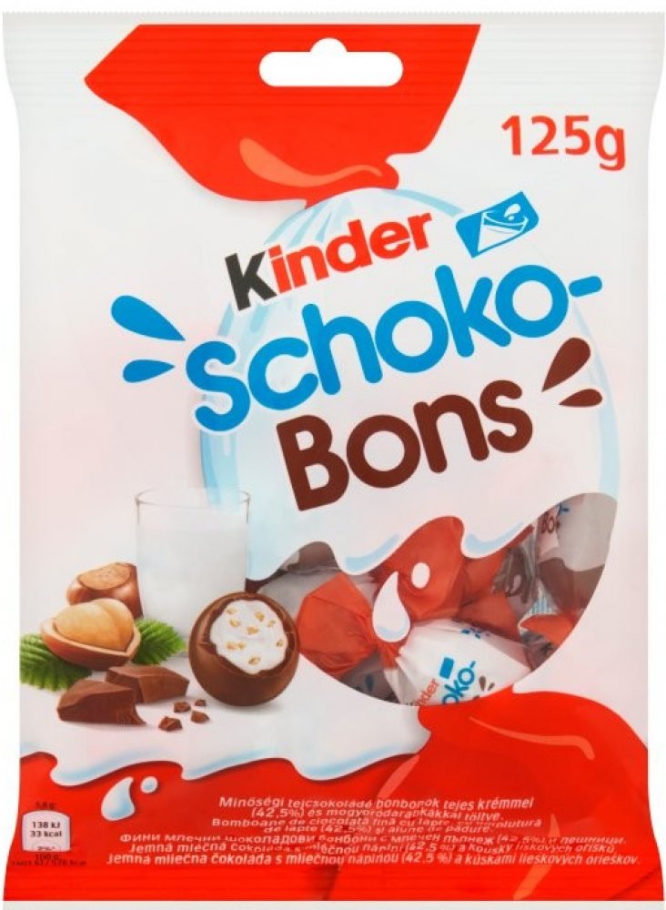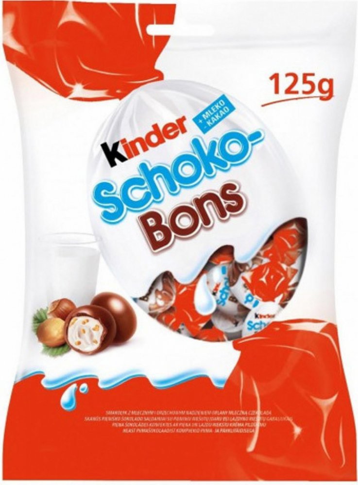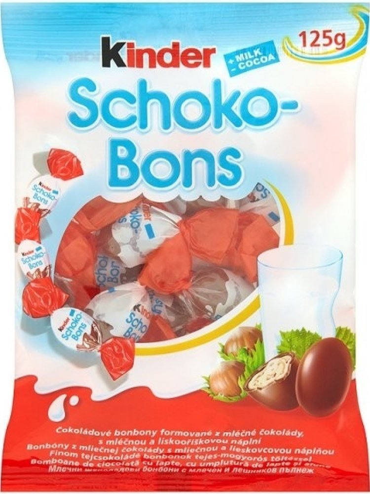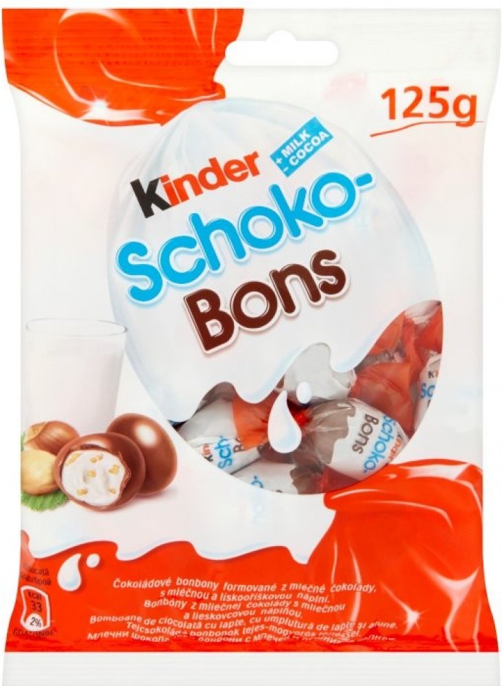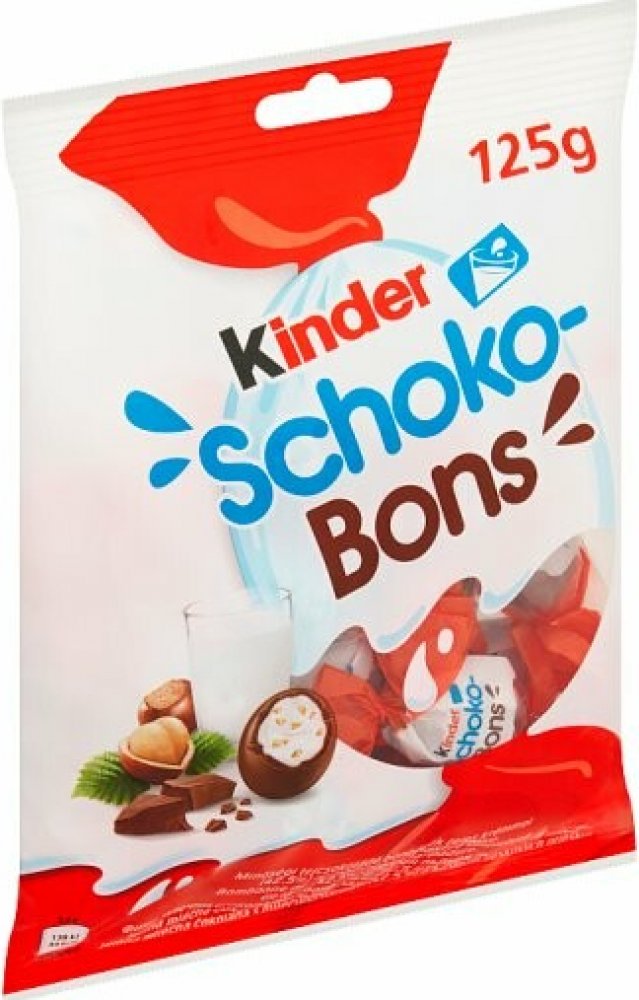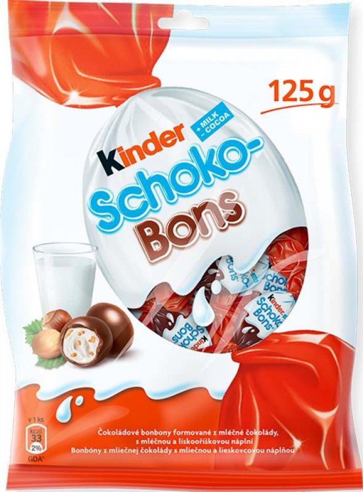 Čokoládové bonbony Kinder Schoko-Bons skrývají pod vrstvou mléčné čokolády mléčnou náplň s křupavými lískovými oříšky. O čokoládové bonbony se nebudete chtít dělit ani se svými dětmi! Řešení je jednoduché: objednejte rovnou více balení. Cukrovinka Kinder Schoko-Bons nesmí chybět na žádné narozeninové oslavě a party. Jednotlivé bonbony jsou hygienicky zabalené a můžete je tak nasypat na talířek. Užijte si jedinečný požitek z chuti typické pro Kinder cukrovinky!