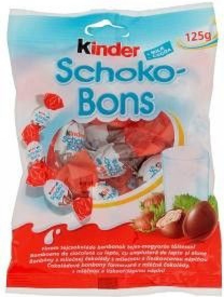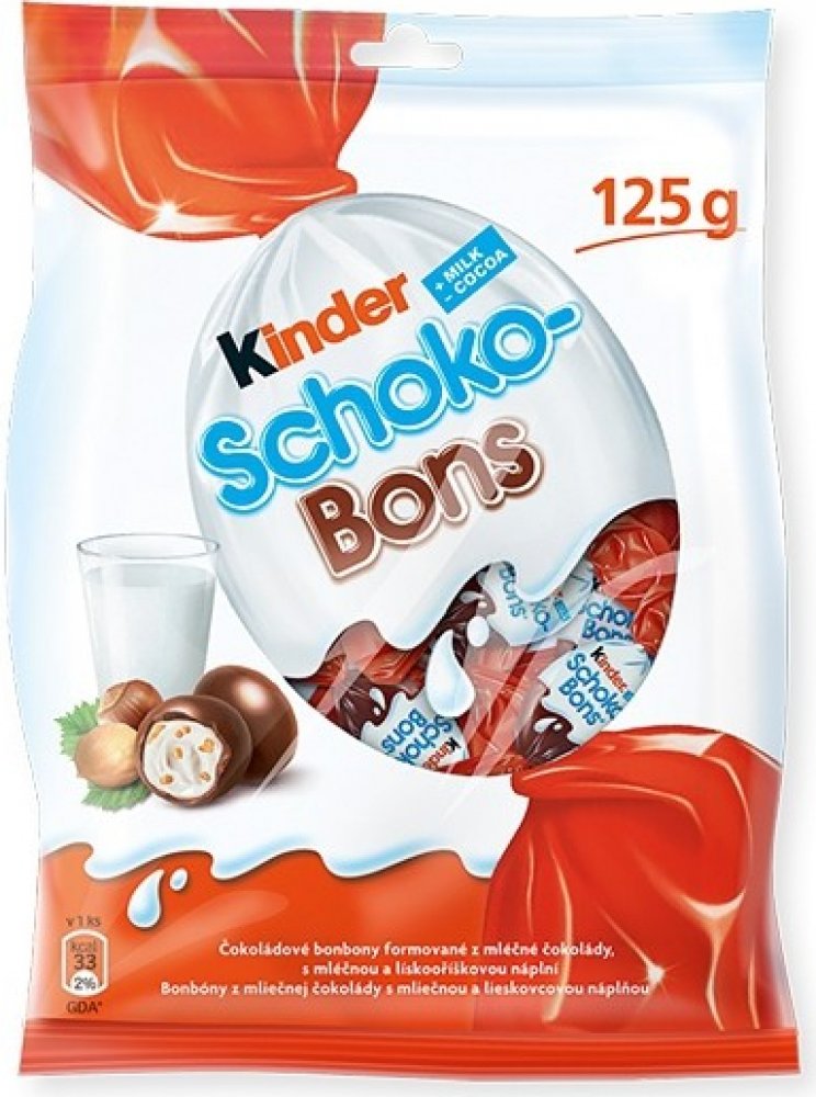 Výrobce: Ferrero, Značka: Kinder, Popis: Kinder Schoko-Bons: měkké krémové srdce s křupavými lískovými oříšky, zalité vrstvou jemné čokolády Kinder. Jedinečný požitek z chuti, který přináší zábavu a o který se díky samostatně baleným kouskům snadno podělíte., Země: Itálie, Hmotnost: 125 g, Alergeny: MLÉKO, SÓJA, LÍSKOVÉ OŘÍŠKY, MÁSELNÝ TUK, Složení: Mléčná čokoláda 50 % (cukr, plnotučné sušené mlé...