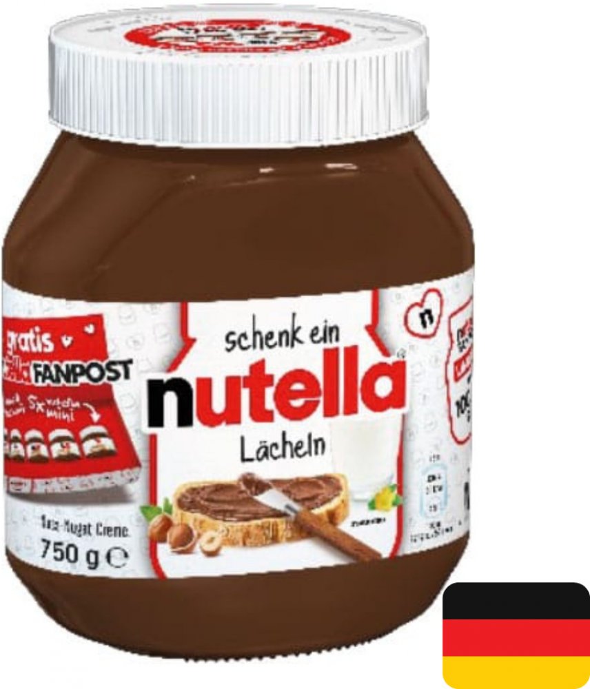 Německá Ferrero Nutella lískooříšková pomazánka s kakaem 750 g - výhodné balení čokoládové pomazánky Nutella. Složení - Cukr, Palmový olej, Lískové oříšky (13%), Kakaový prášek se sníženým obsahem tuku, Odtučněné sušené mléko (7,5%), Sušená syrovátka, Emulgátor: lecitiny (sójové), Vanilin. Nutriční informace - Energie: 547.00 kilokalorií (kcal) energie: 2284.00 kJ (kJ) tuk: 31,80 tuku, nasycených mastných kyselin: 11.00 Sacharidy: 56,90 Sacharidy, které cukr: 55,90 Protein: 6,60 sůl: 0,10.