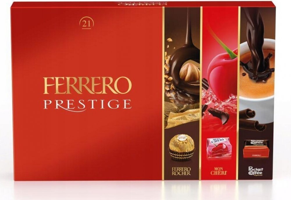 Objevte Ferrero Prestige, exkluzivní směs pralinek od renomované italské rodinné firmy Ferrero. V tomto balení o hmotnosti 246 g najdete tři oblíbené druhy: kultovní Mon Cheri, osvěžující Pocket Coffee a nejznámější Rocher.