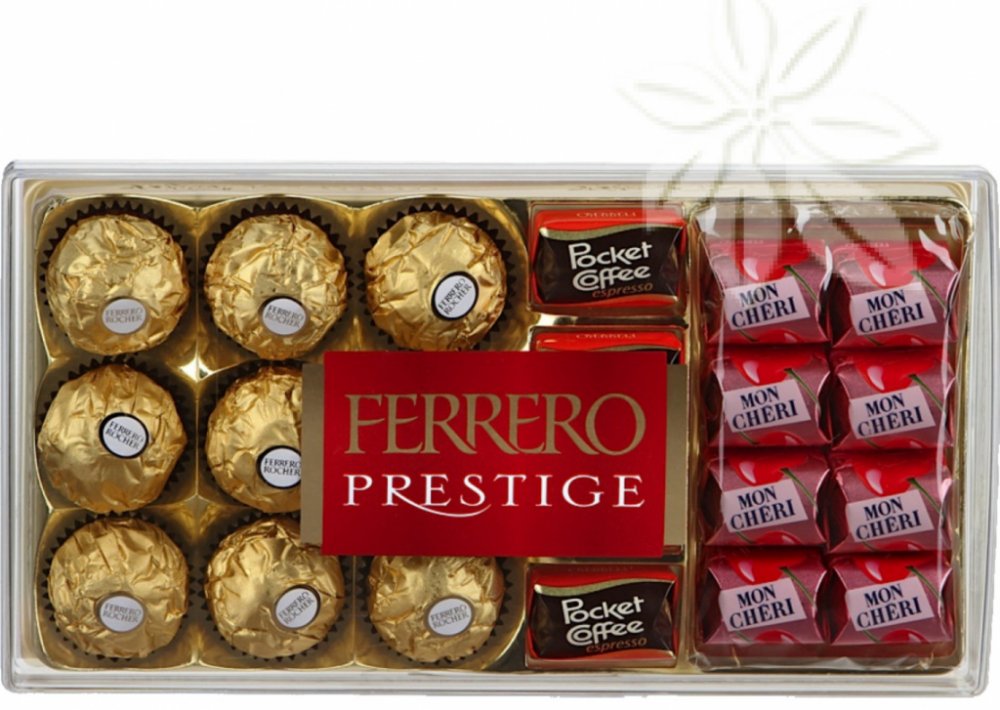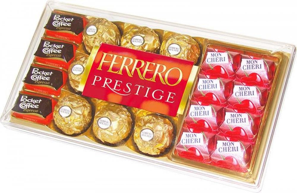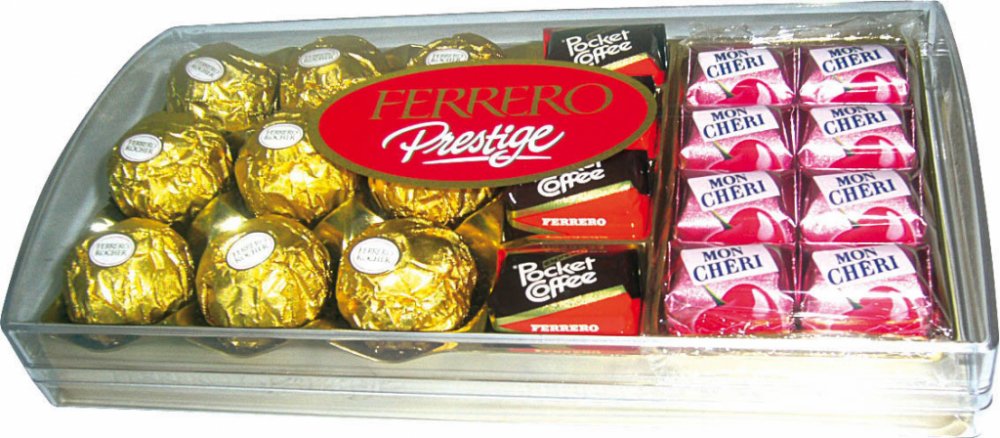 Složení: ROCHER: Složení: ČOKOLÁDA 30% (cukr),kakaové máslo, kakaová hmota, sušené odstředěné sušené mléko,bezvodý MLÉČNÝ tuk, emulgátor:lecitiny (SÓJOVÉ); vanilin), LÍSKOVÉ OŘECHY 28,5%,cukr,palmový olej, PŠENIČNÁ mouka, sušená syrovátka (z MLÉKA),kakaový prášek se sníženým obsahem tuku, emulgátor:lecitiny (SÓJOVÉ), kypřící látka (hydrogenuhličitan sodný), jedlá sůl, vanilin. MON CHERI: Složení: čokoláda 49% (cukr),kakaová hmota, kakaové máslo, emulgátor:lecitiny (SÓJOVÉ); vanilin), cukr,celé třešně (18 %), likér 13 % (glukózový sirup, voda),alkohol, cukr, aroma), kakaové máslo. POCKET COFFEE: Slazená káva 54 %,Cukr,Káva 34 %,Čokoláda 23 %,Kakaová hmota, Cukr,Kakaové máslo, Kávový extrakt, Emulgátor, E322 – lecitin,Vanilka, Čokoláda 14,5 %,Cukr,Kakaová hmota, plnotučné mléko v prášku,Kakaové máslo, extrakt z kávy, emulgátor:E322 – lecitiny, vanilin, kakaové máslo, kakaová hmota,Laktóza, Cukr,Extrakt z kávy, Emulgátor, E322 – lecitin, Vanilka