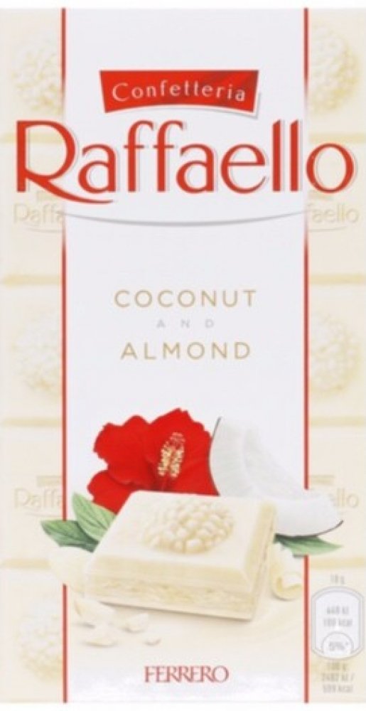 Složení: cukr, kakaové máslo, sušené mléko, strouhaný kokos (10,5%), palmový olej, sušená sladká syrovátka, mandle (3%), sušené kokosové mléko (obsahuje mléko) 2%, máselný tuk, sójový lecitin, aromata. Celkové kakaové složky ve výrobku 20%