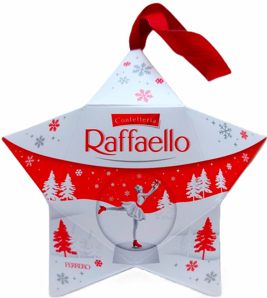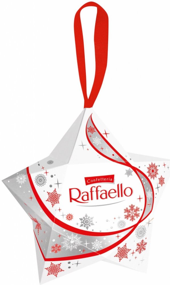 Jednotlivě balené pralinky z kokosu, mléčné smetany a celých mandlí. V dekorativní hvězdicovém balení se závěsným poutkem. Balení obsahuje 4x Raffaello