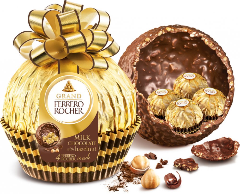 Kulička z lahodné mléčné čokolády s křupavými kousky lískových oříšků obsahuje 4 lahodné pralinky z mléčné čokolády s nugátovou krémovou náplní a celými lískovými oříšky uvnitř. Velká koule je stylově zabalena do zlatého papíru a umístěna v manžetě a s ozdobnou mašlí je ideální jako skvělý tip na vánoční dárek.