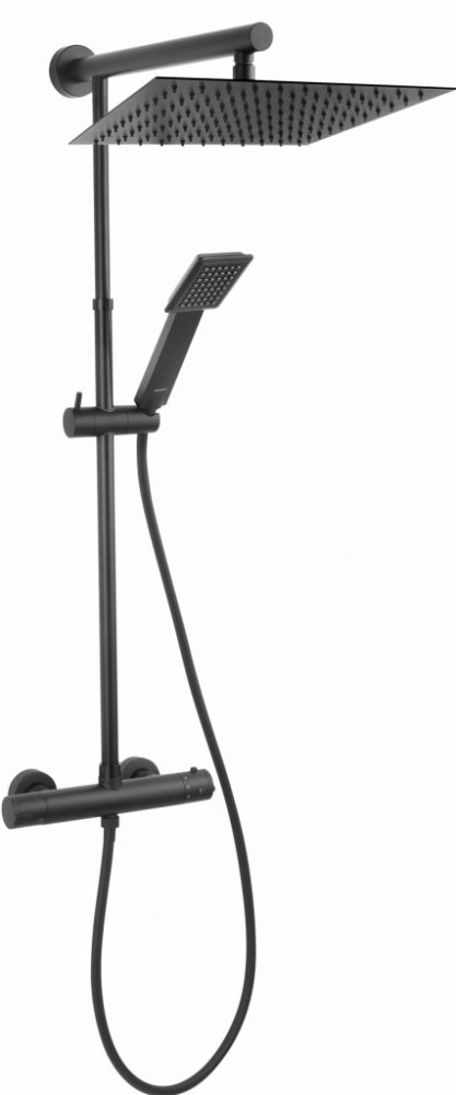 Kompletní nástěnná sprchová souprava v černé barvě.Dešťová sprcha: - kovová tyč s nastavitelnou délkou 800 - 1250 mm - nastavitelná výška upevnění sady na stěnu - úzká ocelová deska sprchové hlavice 300 x 300 mm - montáž na stěnu integrovaná do ramene dešťové sprchy - Systém Ferro Easy Clean - snadné odstraňování vodního kamene Sprchová baterie: - termostatický regulátor - integrovaný keramický přepínač horní sprchy/sprchového ramena - Safe Stop 38 °C - blokování horké vody - nástěnná armatura - excentrické připojení G1/2 rozteč 150 ± 20 mm - připojení dešťové sprchy G3/4 - horní vývod - připojení sprchy G1/2 - spodní vývod Sprcha - 1-funkční sprchová rukojeť - režim proudu: déšť - Systém Ferro Easy Clean - snadné odstraňování vodního kamene - sprchová hadice z PVC 150 cm