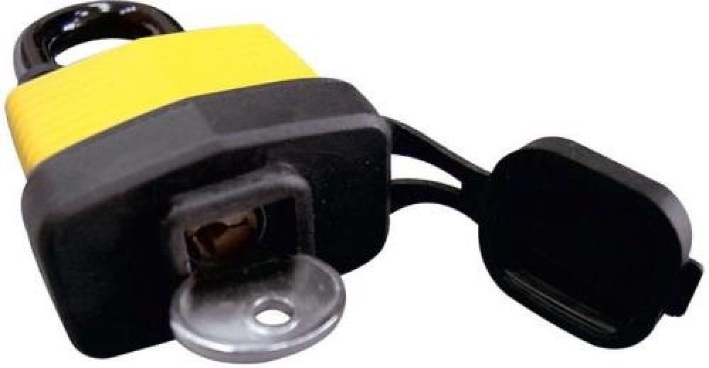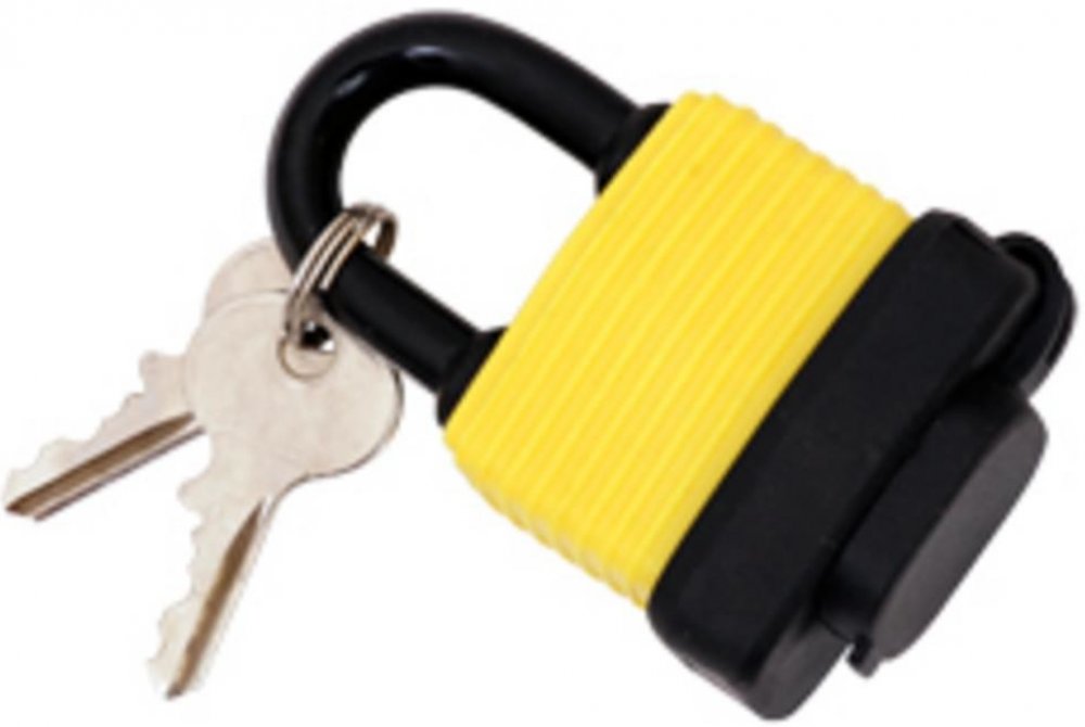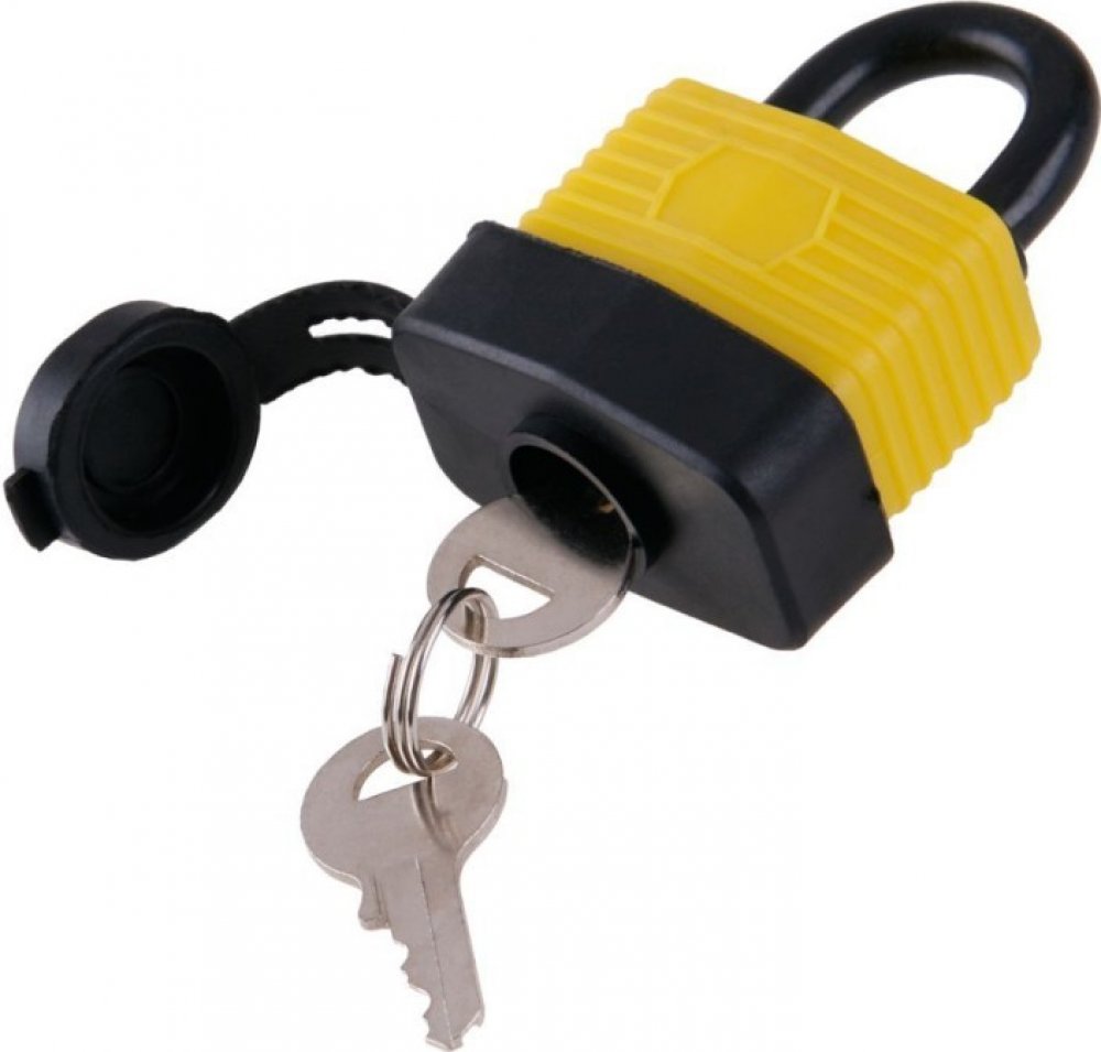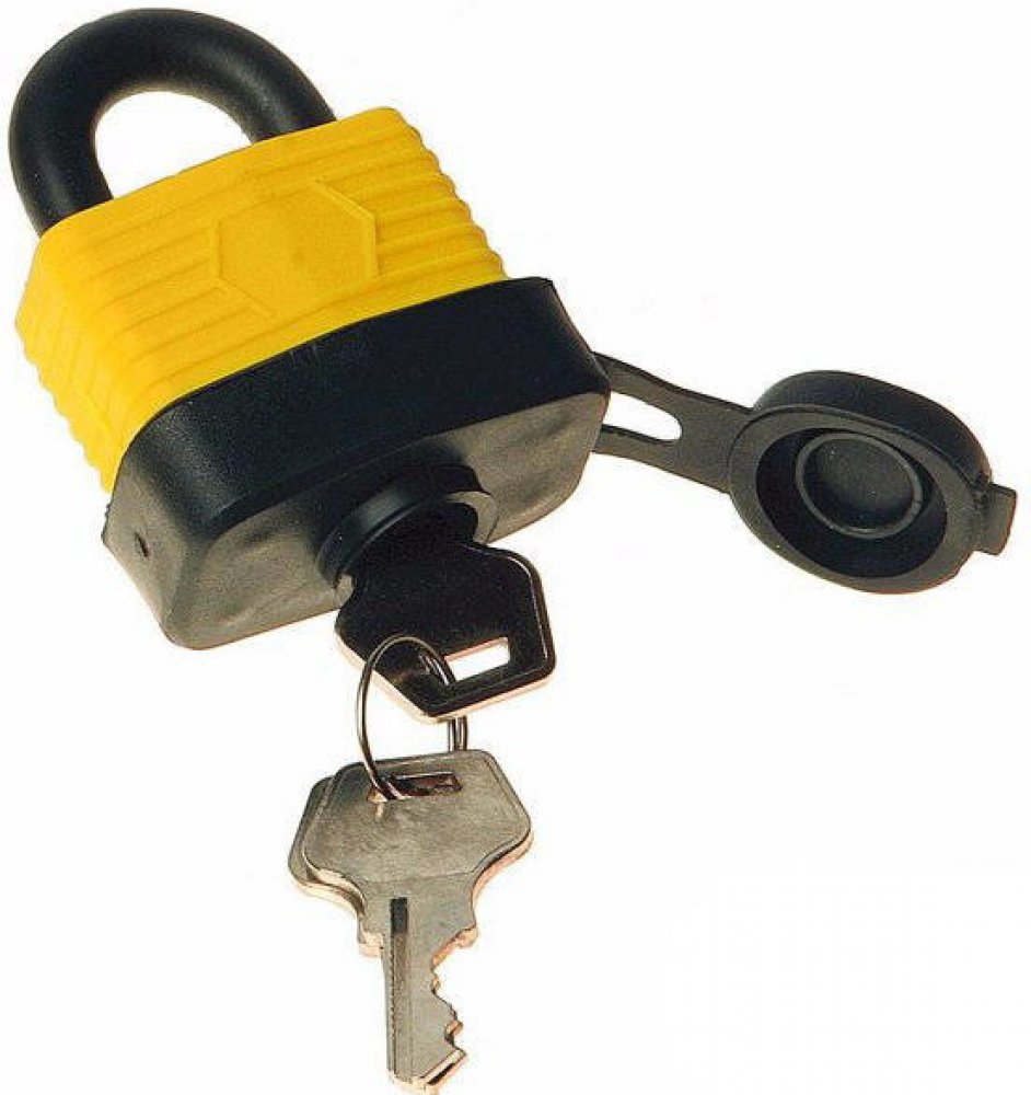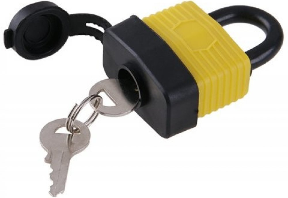 Visací voděodolný zámek se závěsným okem z kvalitní tvrzené oceli. Tělo zámku je z vrstvených pozinkovaných ocelových plátů, potažených plastem pro maximální odolnost proti vodě a vlhkosti. Odnímatelný plastový kryt chrání mosaznou cylindrickou