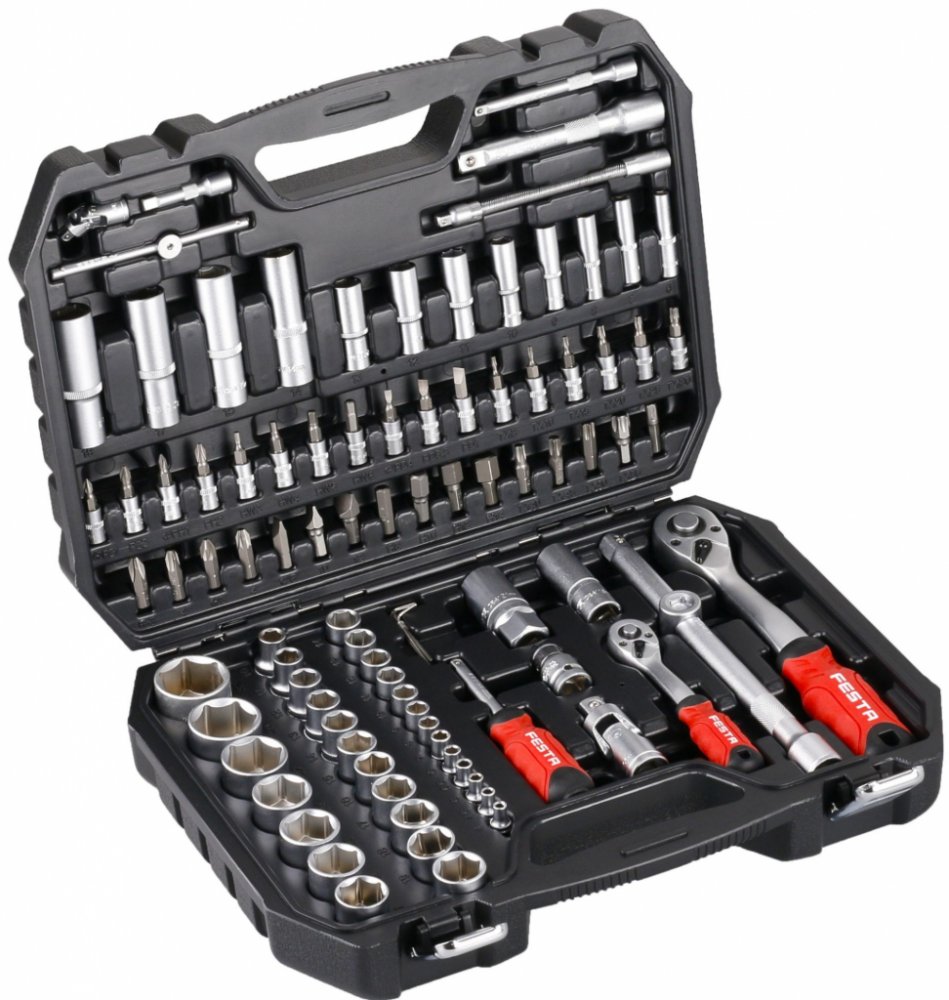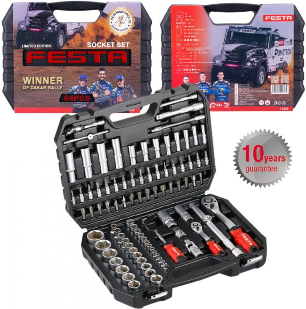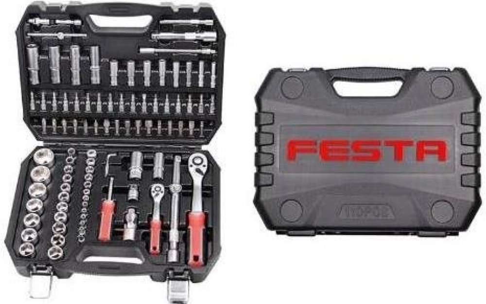 Gola sada FESTA CrV 94ks 1/4 -1/2 Kvalitní gola sada je vhodná díky kvalitě použitých materiálů a zpracování v profesionální autodílně nebo servisu. 10 let záruka. Všechny části jsou vyrobeny z vysoce kvalitní chrom-vanadiové oceli. Niklová povrchová úprava. Hroty bitů jsou ze slitiny oceli S2. Ráčny mají jemné dělení 72 zubů, tělo ráčny z CrV oceli, zubový mechanismus z S2 oceli, ergonomicky tvar...