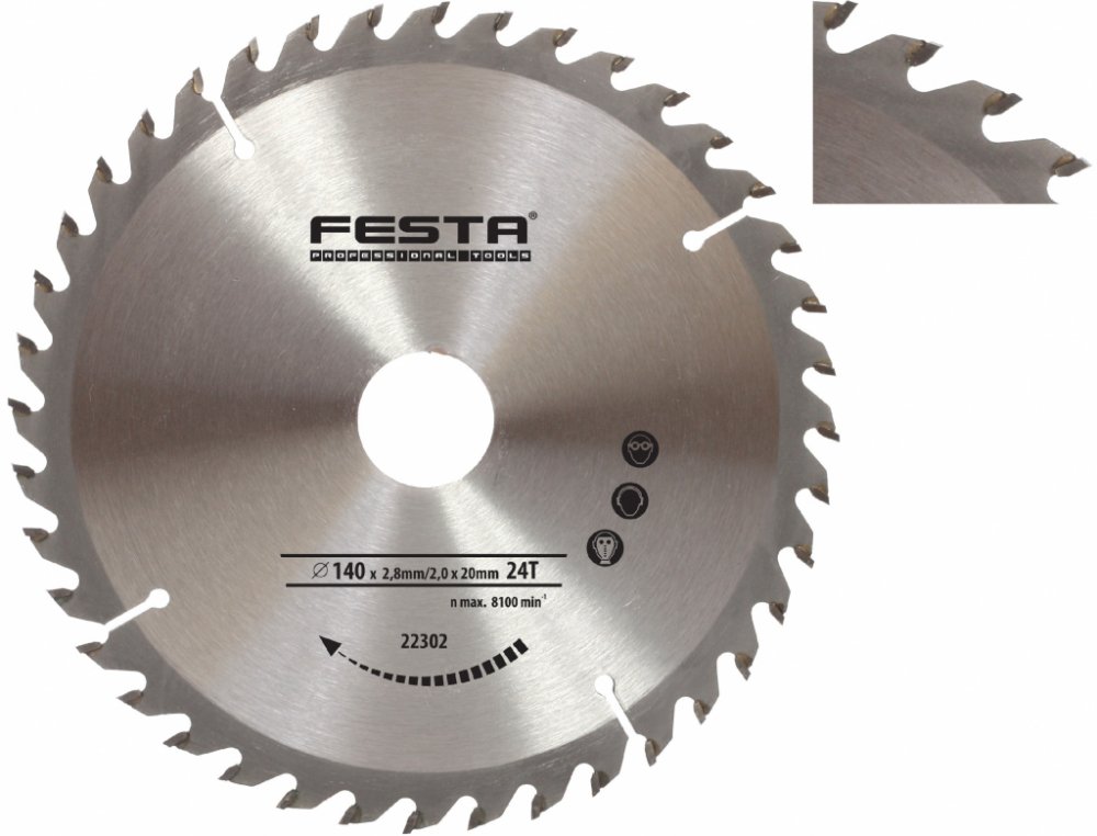 FESTA 22357 Kotouč pilový SK 400/3. 5/30/60Z Tělo z kvalitní uhlíkové oceli (HRC:40) Břitové destičky SK (HRA:90) Střídavý zub Pozitivní úhel čela 15° 4 Zářezy do vnitřní části chrání před přehřátím a deformací kotouče Max. přípustné otáčky: 2800 1/min.