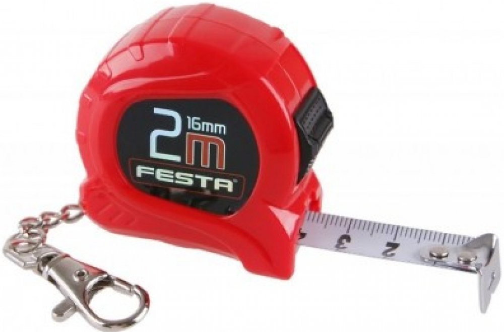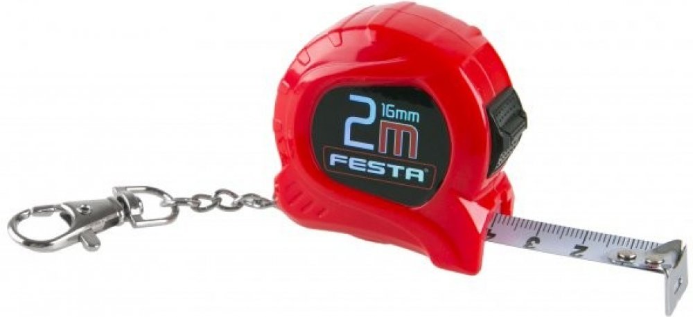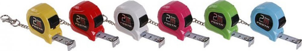 Svinovací metr FESTA - přívěsková varianta s karabinou. Tělo metru vyrobeno z kvalitního ABS plastu, šířka pásky 16mm, 1 brzda s dorazem navíjení pásky, koncový háček s antikorozní úpravou, barva pásky - bílá, dobře čitelná stupnice. V balení mix barevných kombinací (bílá, žlutá, růžová, pastelová modrá a zelená). Baleno v praktické prezentační průhledné dóze.