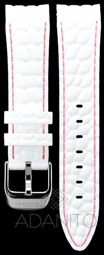 Silikonový řemínek na hodinky FESTINA má šířku 20 mm. Řemínek má bílou barvu, ocelovou stříbrnou přezku a je prošitý růžovou nití. Řemínek je určen na hodinky FESTINA 16541/3 nebo řady 16541.