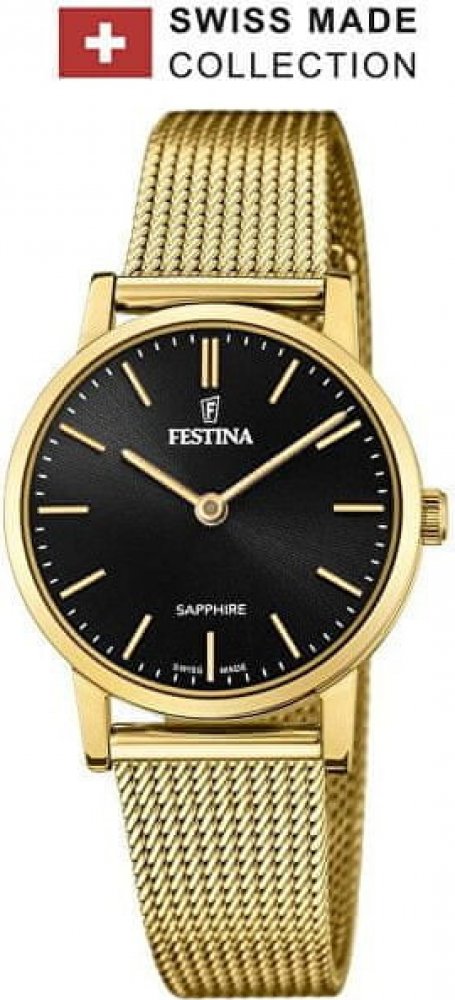 Festina analogové ocel ocel 50 m bateriové 69.57 g safírové elegantní dámské bateriové - quartz Swiss Made kulaté zlatá černá posuvná spona 1.495 cm