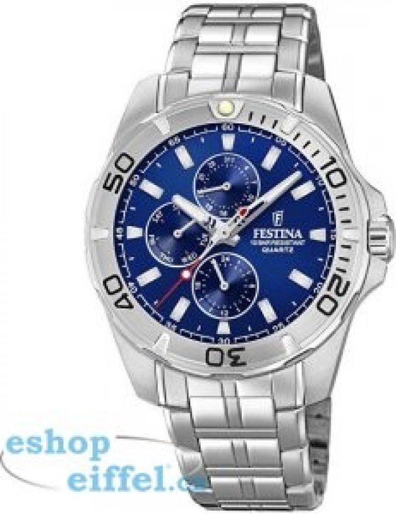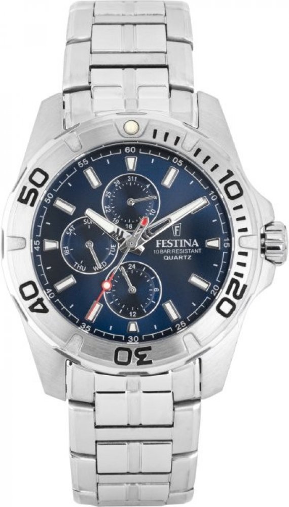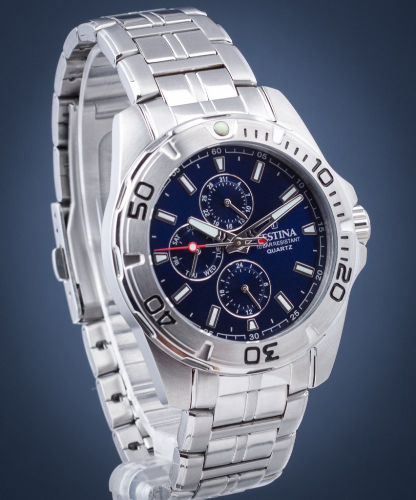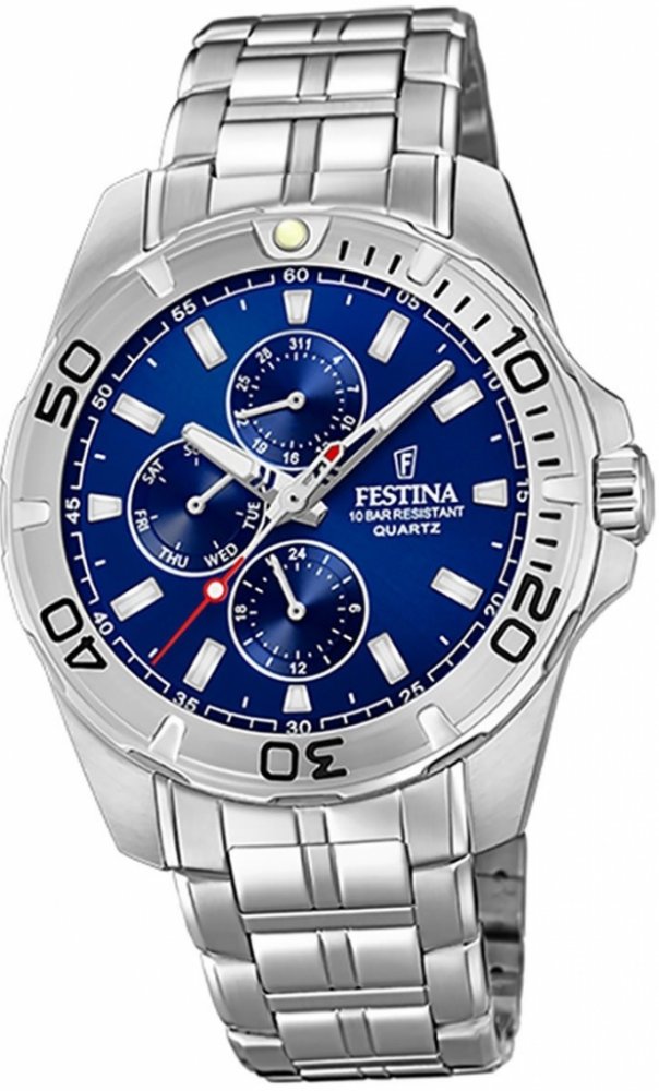 Festina analogové ocel ocel 100 m bateriové 150 g minerální sportovní pánské bateriové - quartz bez osazení Multifunction kulaté stříbrná modrá překlápěcí spona 2.2 cm pro potápění (100+ m) s dočasným svícením (luminiscence/LED) s nenáročnou údržbou (quartz) bez chytrých funkcí na ruku bez číslic stříbrná ocel 4.3 cm střední ocel 12.0 mm 3 12.0 mm 43 mm 43 mm s luminiscencí