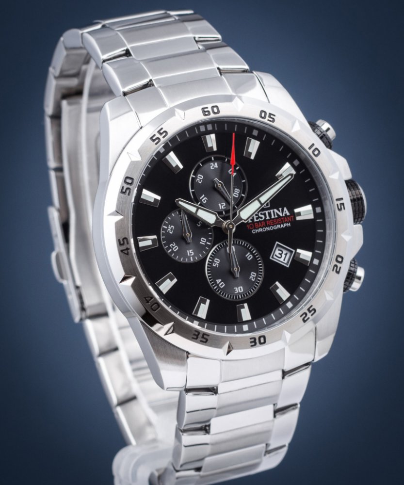 Festina analogové ocel sportovní pánské bateriové - quartz pro potápění (100+ m) 45.05 mm ocel 100 m bateriové 173.0 g minerální 2.38 cm Chrono Sport kulaté stříbrná černá s luminiscencí překlápěcí spona 2.38 cm na ruku švýcarské bez číslic stříbrná ocel 4.505 cm velké max. 30 minut chodu s přesností 1/1 sekundy ocel 12.9 mm 23.8 mm 3 12.0 mm 45.05 mm s dočasným svícením (luminiscence/LED) s nenáročnou údržbou (quartz) bez chytrých funkcí