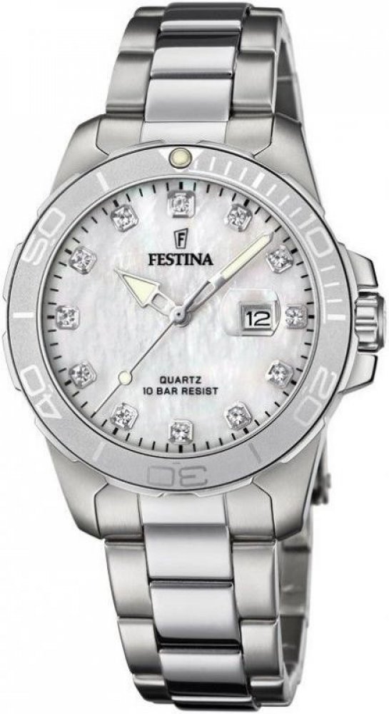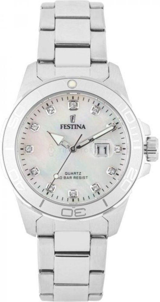 Festina analogové ocel elegantní dámské bateriové - quartz pro potápění (100+ m) 34.5 mm ocel 100 m bateriové 90 g minerální 19.5 cm zirkony Boyfriend kulaté stříbrná bílá s luminiscencí překlápěcí spona 1.68 cm na ruku bez číslic 3.5 cm malé jednosměrně otočná Ocel 11.0 mm 16.8 mm 11.0 mm 34.5 mm s dočasným svícením (luminiscence/LED) s nenáročnou údržbou (quartz) bez chytrých funkcí
