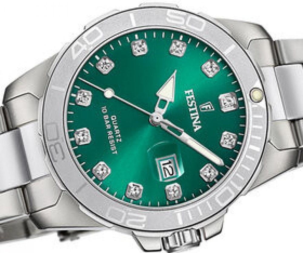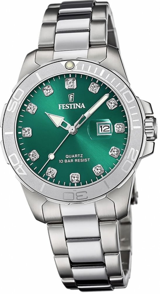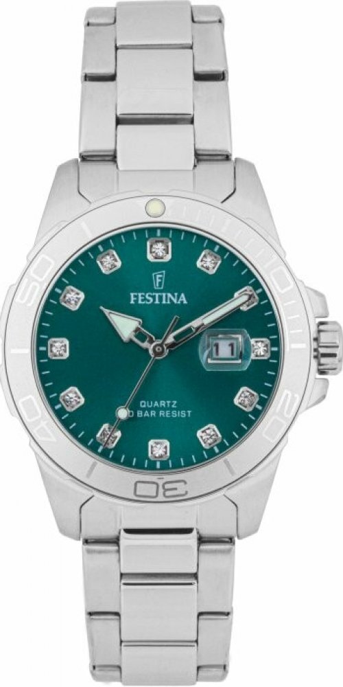 Festina analogové ocel ocel 100 m bateriové 55 g minerální klasické dámské bateriové - quartz zirkony Boyfriend kulaté stříbrná zelená na přezku 1.68 cm