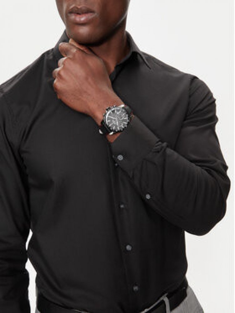 Sportovně - společenské hodinky s kulatým, ocelovým pouzdrem pohání quartzový (bateriový) strojek s chronografem a ukazatelem data. Čas na černém číselníku zobrazují indexy s luminiscencí. Číselník je kryt rovným minerálním sklem a díky vodotěsnosti 100 M si s hodinkami můžete bez obav zaplavat. Hodinky pro pravého gentlemana podtrhne černý kožený řemínek s červeným prošitím.