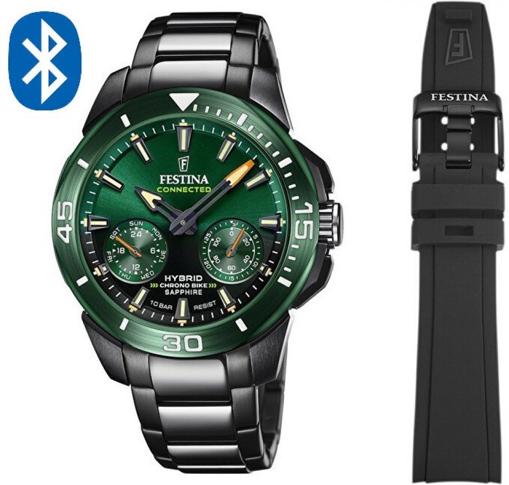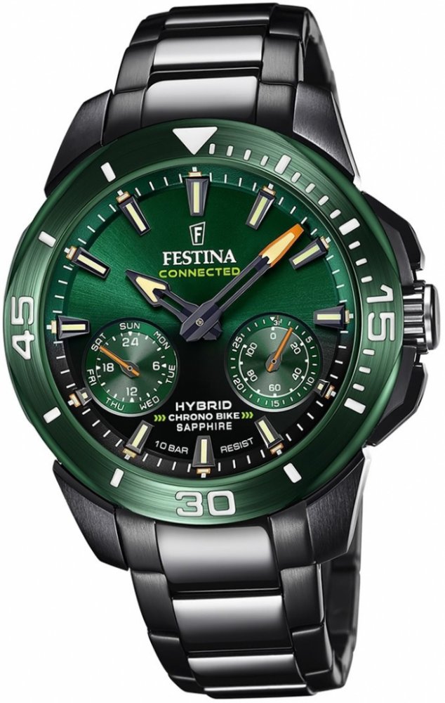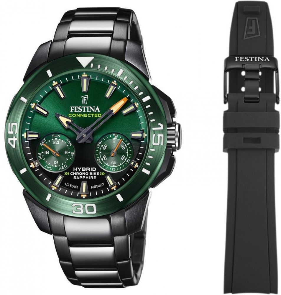 Pánské hodinky FESTINA Chrono Bike ´22 F20646/1 představují úžasný moderní chronograf s bohatou výbavou. Na zeleném číselníku jsou výborně viditelné černé skeletonové luminiscenční ručky a indexy. Dva malé multifunkční číselníky skýtají funkce jako ukazatele data, dne v týdnu a 24 hodin, budík, barometr; teploměr; připojení Bluetooth s funkcí "Najdi telefon" a "Doveď mě domů"; ukládání GPS pozice; automatická časová zóna, informace o počasí; ovládání fotoaparátu a hudby, tichý budík a IFTTT. Kromě toho jsou vybaveny krokoměrem a informují o příliš dlouhém sezení. Číselník je chráněn safírovým sklem odolným proti poškrábání. Na zelené lunetě je stupnice. Pouzdro s krytem korunky a náramek jsou vyrobeny z ušlechtilé oceli s černým povlakem metodou PVD, která vyniká vysokou odolností. Hodinky jsou vodotěsné do 10 ATM a vydrží tak plavání i šnorchlování. Jejich design a použité barvy byly inspirovány silniční cyklistikou. Součástí základní výbavy je náhradní řemínek.