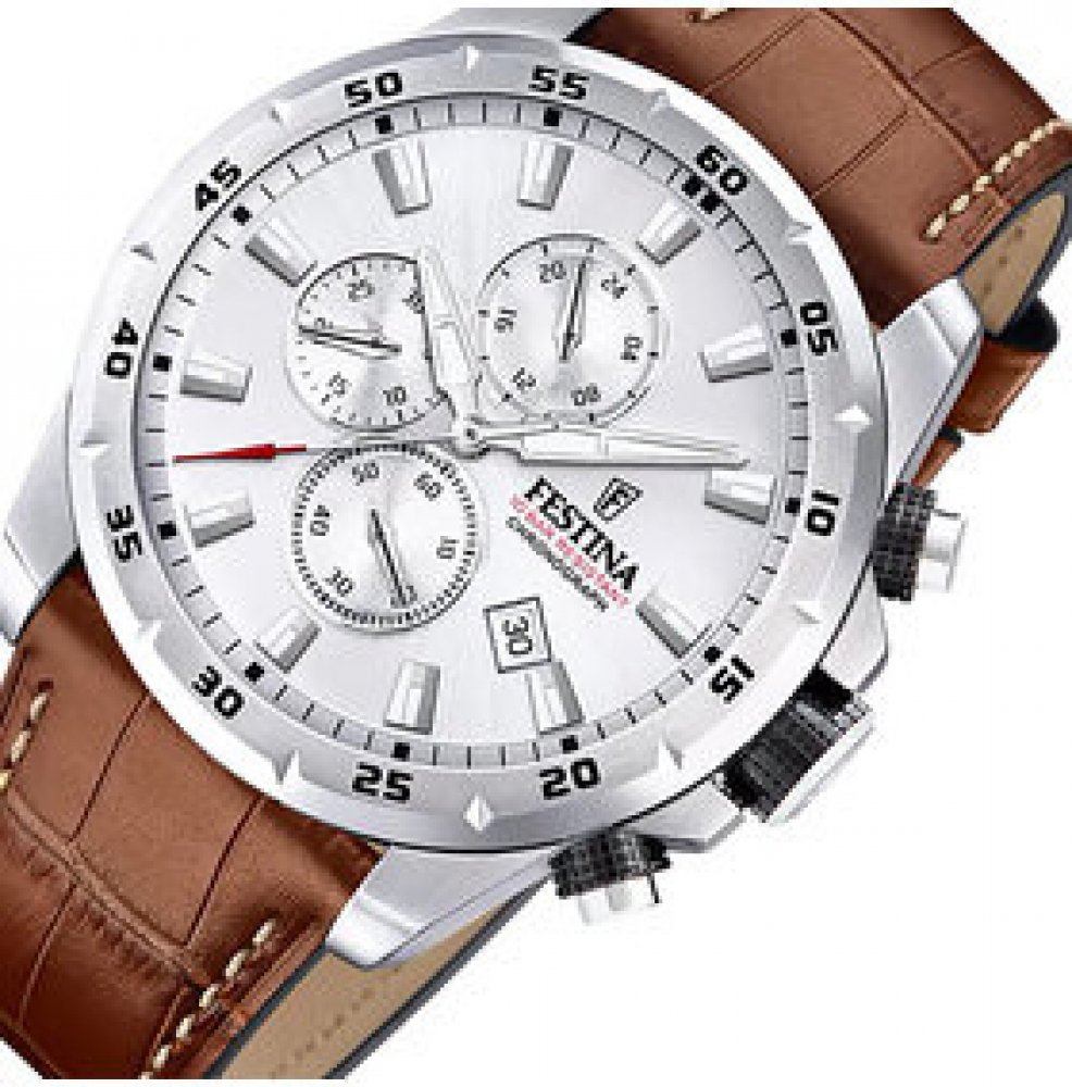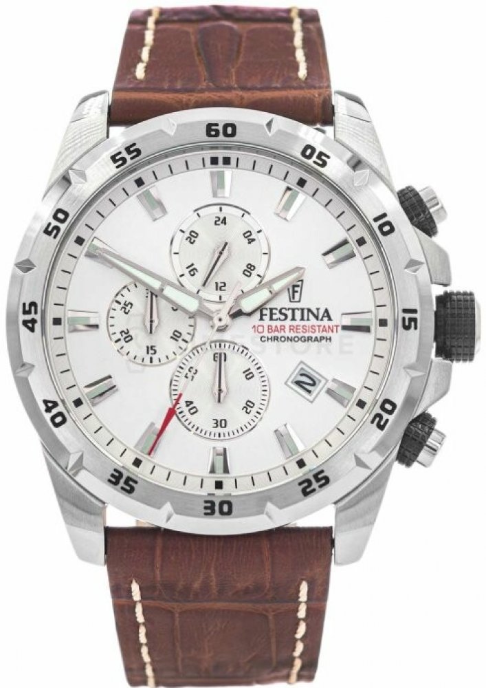 Festina analogové kůže sportovní pánské bateriové - quartz pro potápění (100+ m) 45.05 mm ocel 100 m bateriové 91 g minerální bez osazení Timeless Chronograph kulaté hnědá stříbrná s luminiscencí trnová spona 2.4 cm na ruku bez číslic stříbrná ocel 4.505 cm velké max. 30 minut chodu s přesností 1/1 sekundy pevná 24.0 mm 3 12.4 mm s dočasným svícením (luminiscence/LED) s nenáročnou údržbou (quartz) bez chytrých funkcí