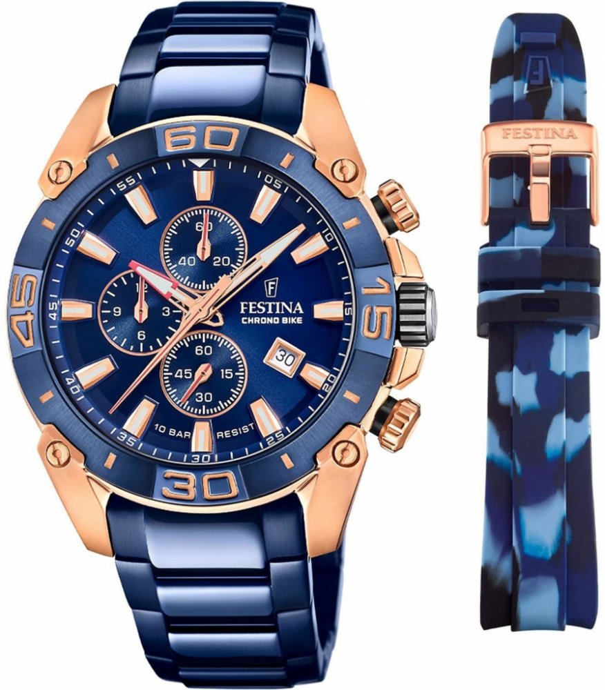 Festina analogové ocel ocel 100 m 185 g safírové sportovní pánské bateriové - quartz Chrono Bike kulaté modrá modrá překlápěcí spona 2.18 cm