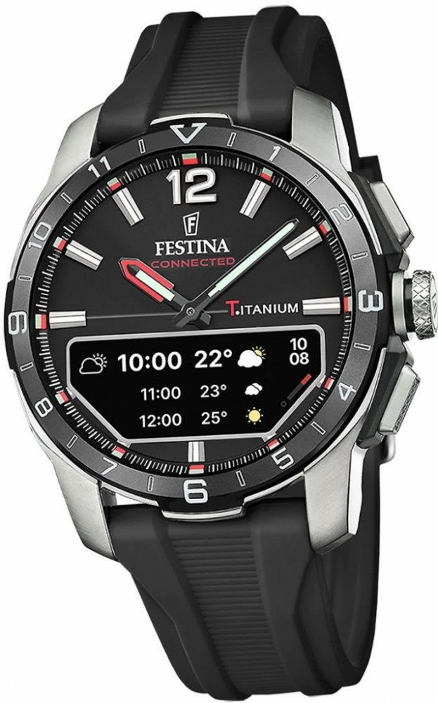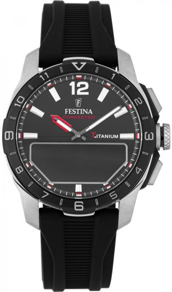 Festina kombinované silikon sportovní pánské bateriové - quartz pro potápění (100+ m) 44 mm titan 100.0 m akumulátorové 87 g safírové 2.28 cm Connected kulaté černá černá trnová spona 2.3 cm na ruku bez číslic stříbrná ocel 4.4 cm střední 10 d 13.9 mm 23.0 mm 13.96 mm s nenáročnou údržbou (quartz) s připojením k telefonu (Bluetooth/GPS)
