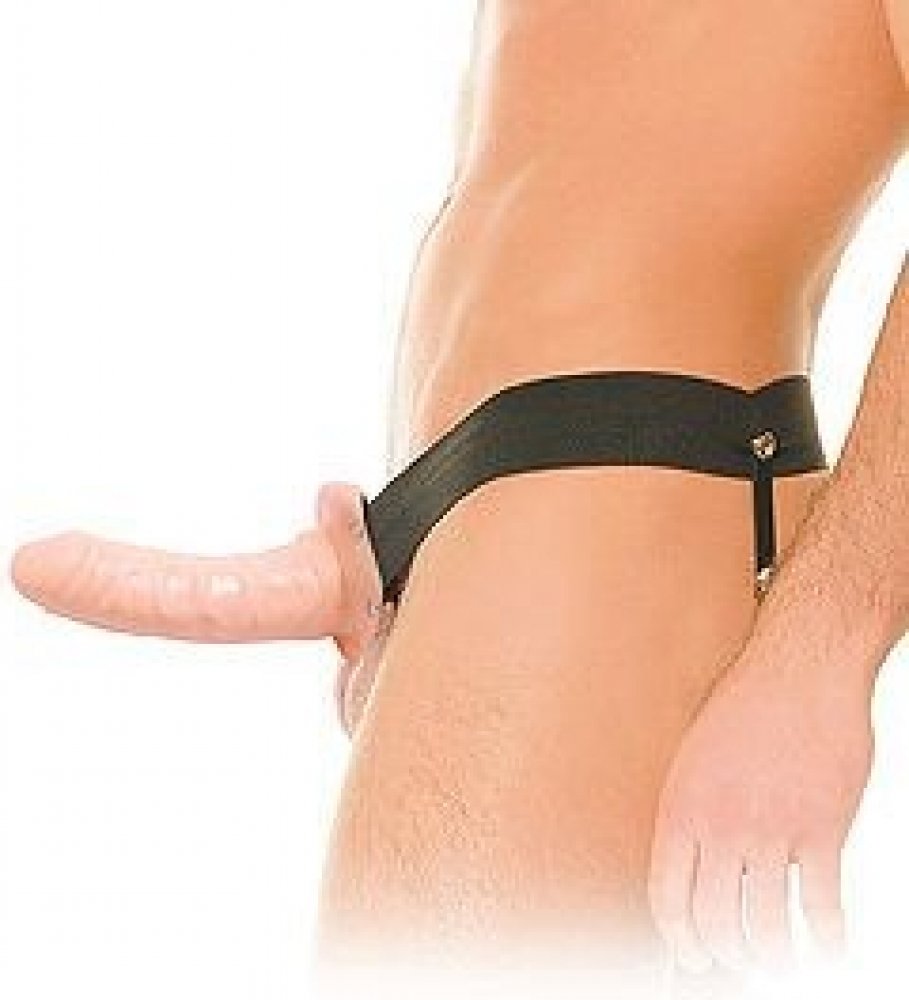 V tělové barvě realisticky tvarovaný masivní penis je připevněn k elastickým nastavitelným popruhům.