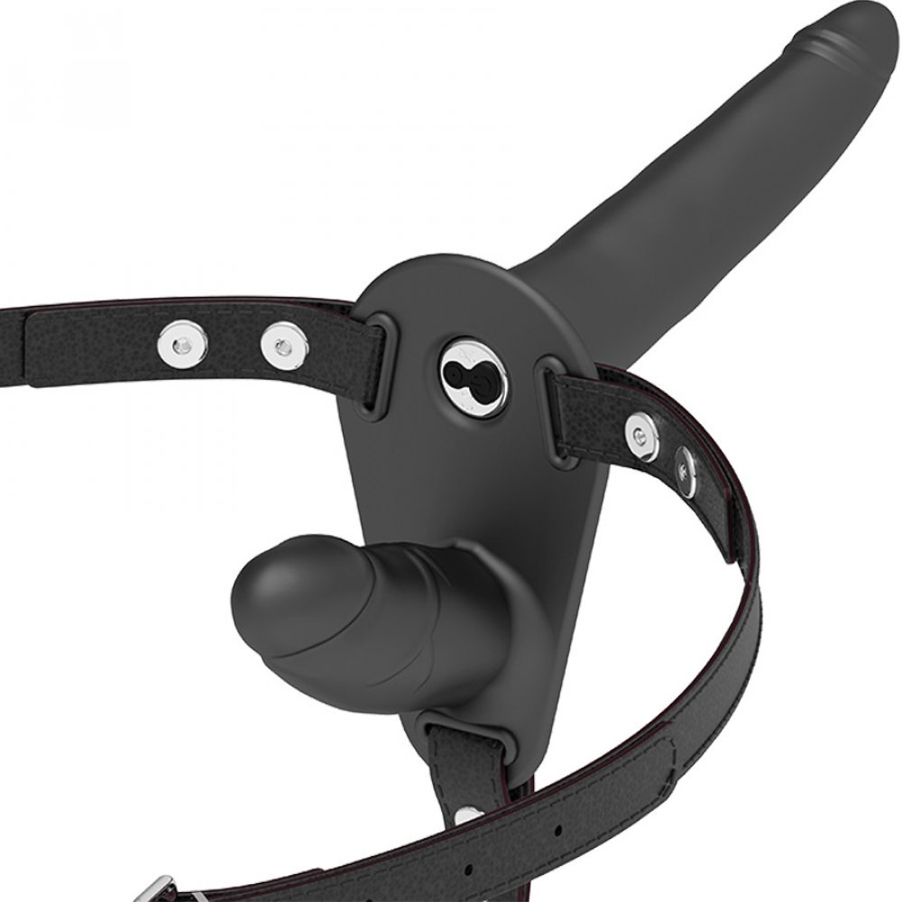 Dvojitý průchozí postroj nastavitelný na jakoukoli velikost boků, i na ty největší. Dildo je vyrobeno z prvotřídního silikonu.