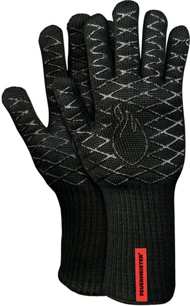 Kevlarové grilovací rukavice BBQ Premium představují již druhou generaci produktů značky FEUERMEISTER®. Tepluodolné rukavice se vyznačují kvalitním zpracováním a dvojím bezešvým opletem. Vnější prodyšná část rukavic je vyrobena z černých žáruvzdorných aramidových vláken Nomex. Pro maximální komfort je vnitřní část rukavic vyrobena z vlny (80%) a polyesteru (20%). Pro jistý a neklouzající úchop jsou rukavice na obou stranách opatřeny aplikací z velmi kvalitního žáruvzdorného silikonu s vyobrazením loga výrobce ve střední části a výraznou nášivkou FEUERMEISTER® coby pečetí kvality. Oboustranná aplikace silikonu poskytuje možnost použití rukavice na pravé i levé ruce. Ani přes opakované použití a praní rukavice neztratí nic ze svého tvaru a dlouhodobé trvanlivosti. Rukavice jsou dostatečně dlouhé, aby ochránily předloktí před žárem a poletujícími jiskrami.