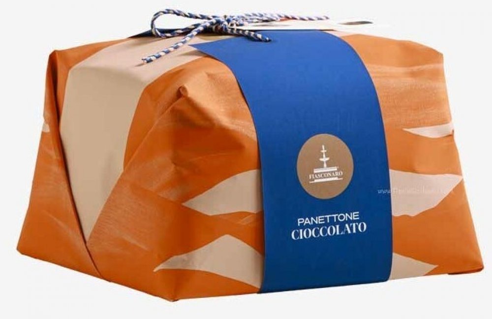 Panettone s čokoládovými lupínky přelité polevou, ručně balené.