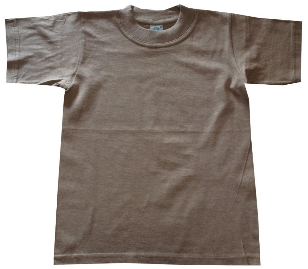 Dětské bavlněné trička v hnědé barvě je o gramáži 150g/m2. Tričko je bez potisku, výstřih je ukončen do oblouku.