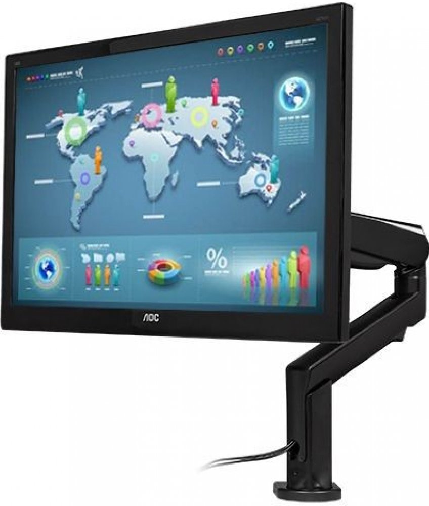 Nabízíme Vám špičkový držák na televizi nebo monitor s uchycením na stolovou desku, který je plně polohovatelný - otáčení do stran, nastavení náklonu, výšky a vzdálenosti obrazovky monitoru od uchycení, otáčení do horizontální nebo vertikální polohy (obrazovka na šířku nebo na výšku). Držák je ideální pro zavěšení všech typů televizorů a monitorů s úhlopříčkou 17" - 32" a hmotností do 8kg včetně. Nastavení výšky umožňuje plynová pružina, kterou snadno nastavíte přesně na hmotnost zavěšené obrazovky. Polohování je pak velmi snadné, příjemné a zvládnou to i děti. Držák má systém pro vedení kabeláže a 2x připojení USB portů. Barevné provedení černé. Záruka 3 roky.