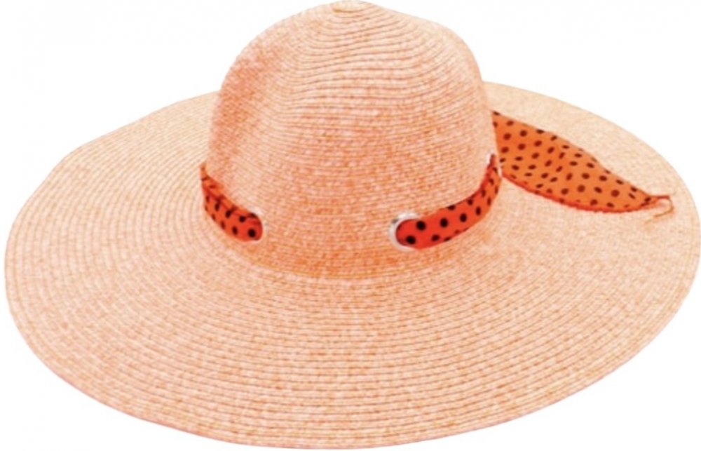Klasický dámský klobouk z glazovaného papíru s kulatou hlavou a širokou krempou a zdobením po obvodu krempy.