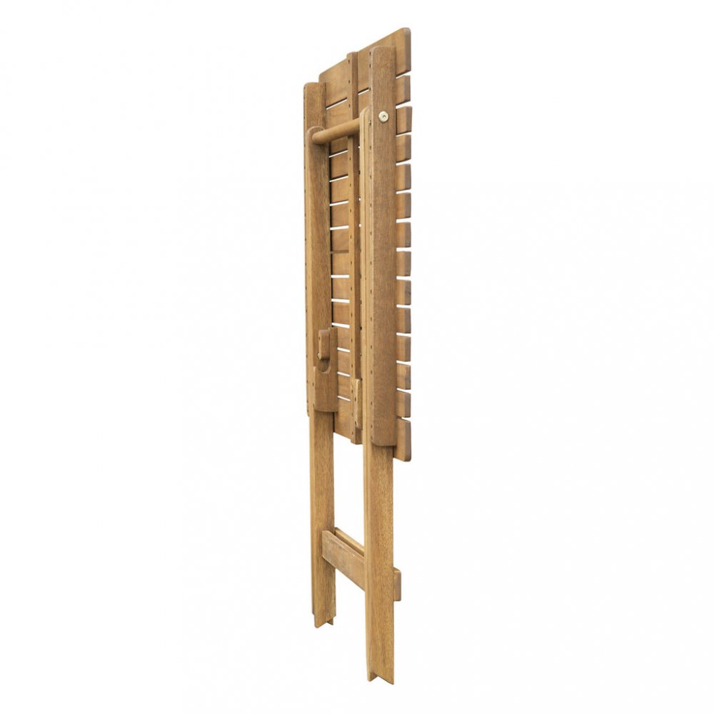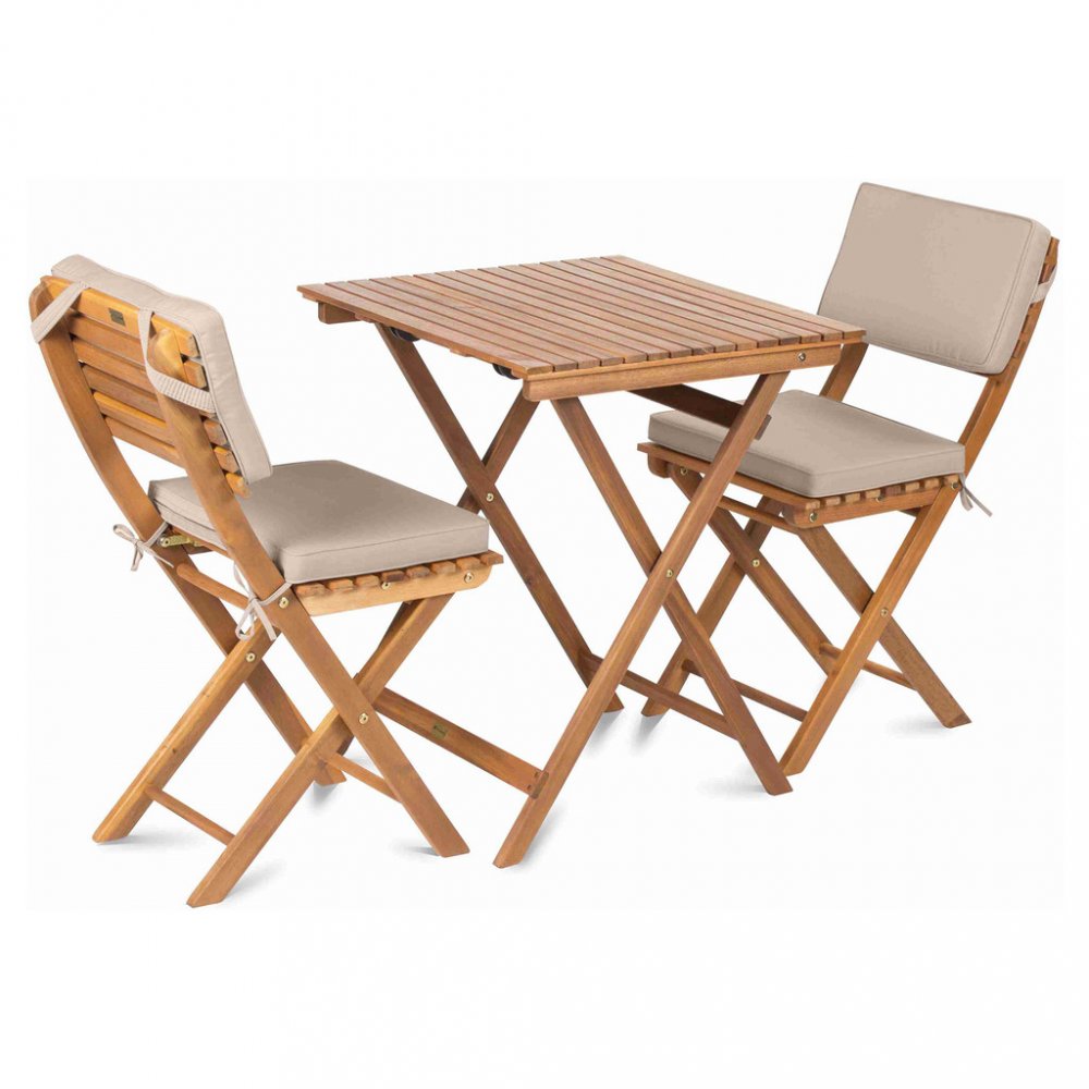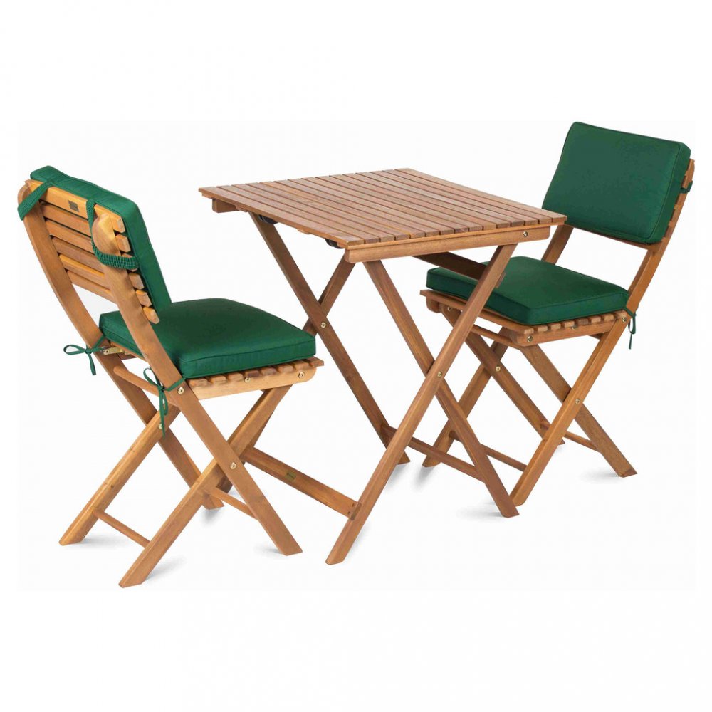 Větší a pohodlnější sestava balkónového nábytku. Lehce rozložitelný čtvercový stolek o rozměrech 65 x 65 cm je doplněn dvojicí židlí 55 x 40 x 81 cm. K židlím je možné dokoupit sadu polštářů sedáku a zádové opěrky. Všechny komponenty je možné snadno složit a minimalizovat tak nároky na jejich uskladnění. Stůl i židle jsou vyrobeny z tropické dřeviny Akácie. Toto velice tvrdé dřevo bez problémů odolává i nepřízni povětrnostních vlivů