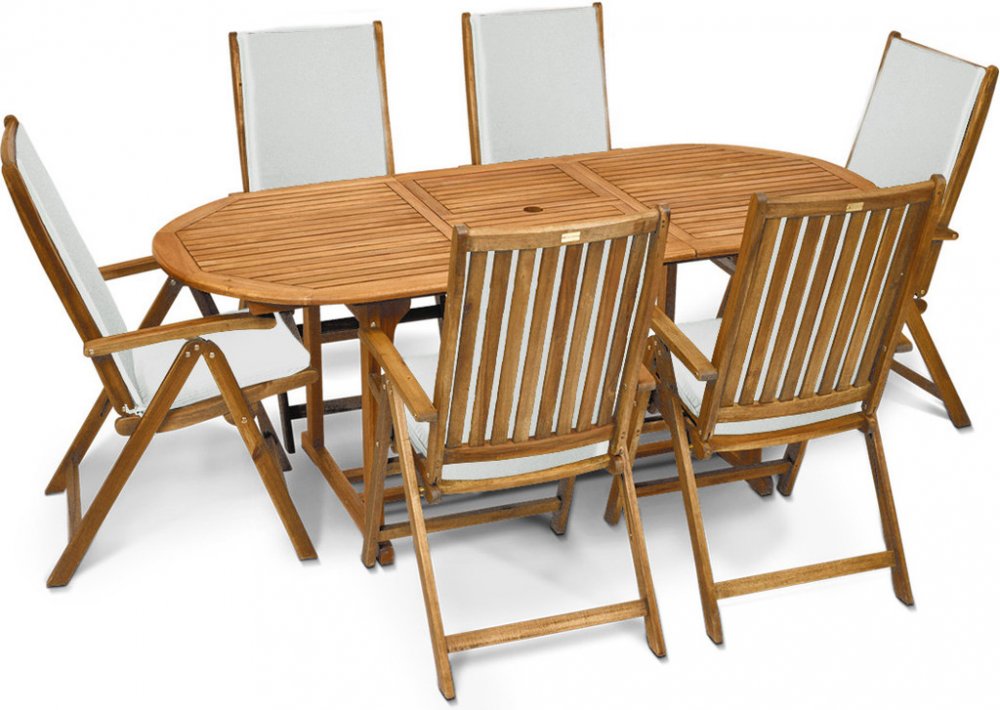 Sestava zahradního nábytku určená pro náročné uživatele. K rozkládacímu stolu je možné umístit až 6 ergonomicky tvarovaných křesel. Základní rozměr stolu je 150 x 90 cm, lze ho však rozložit až do délky 200 cm. Po rozložení je možné do středu umístit slunečník. Úhel sklonu zádové opěrky je možné nastavit v 5 polohách. Ke křeslům je možné dokoupit pratelné potahy zelené a bíle barvy. Stůl i křesla jsou vyrobeny z tropické dřeviny Akácie. Toto velice tvrdé dřevo bez problémů odolává i nepřízni povětrnostních vlivů a předurčuje tento nábytek k venkovnímu použití.