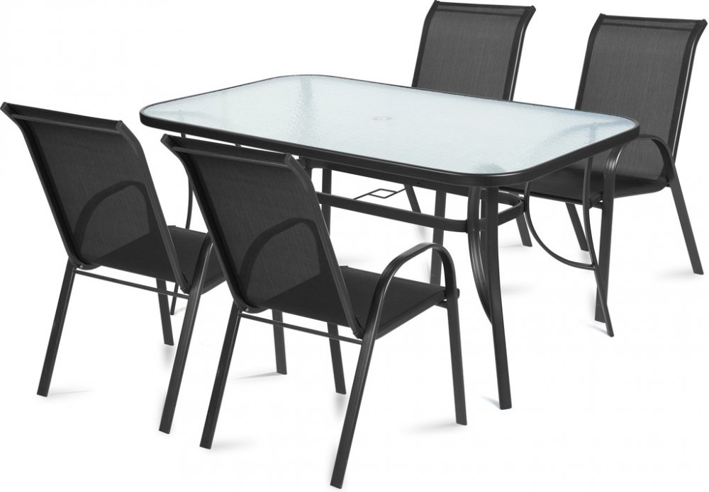 Kvalitní a cenově dostupná sestava zahradního nábytku. Set je složen ze stolu s čirou deskou o rozměru 150 x 93x 71 cm a čtyř křesel 55 x 73 x 91 cm. Deska stolu je vyrobena z tvrzeného skla a v jejím středu je otvor pro slunečník. Výplň křesel z pružné syntetické textilie zvyšuje pohodlí. Tento nábytek je zcela bezúdržbový a je ideální volbou pro venkovní použití.