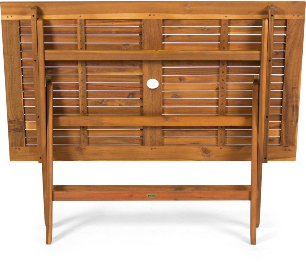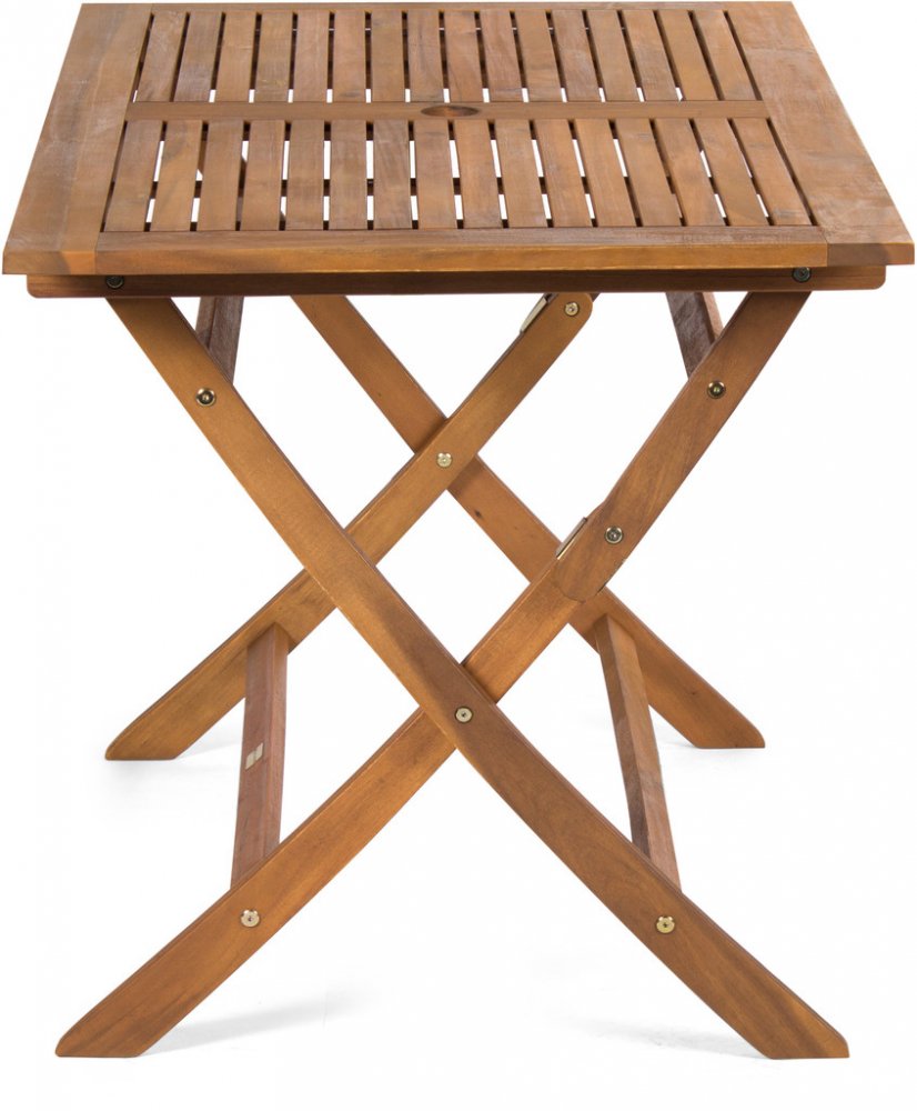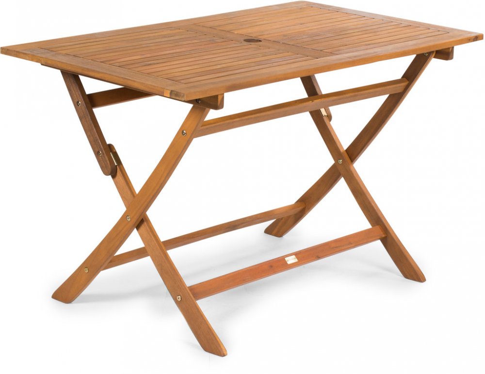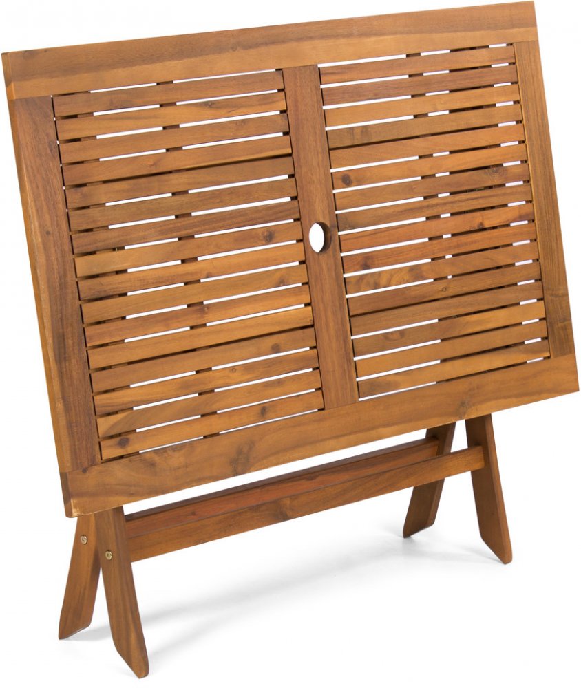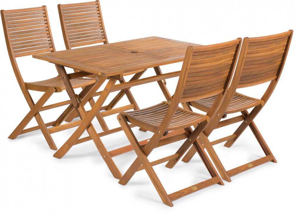 Stůl o rozměrech 120 × 70 × 74 cm je vybaven praktickým otvorem pro slunečník, který vám zajistí stín i během horkých letních dnů. Díky možnosti složení stolu i židlí šetříte místo při skladování, což oceníte zejména mimo sezónu nebo při přepravě. Skládací židle s nosností až 110 kg poskytují pohodlí a zároveň mají ve složeném stavu minimální nároky na prostor. Pro ještě větší komfort si můžete dokoupit podsedáky.