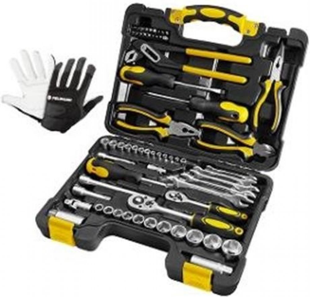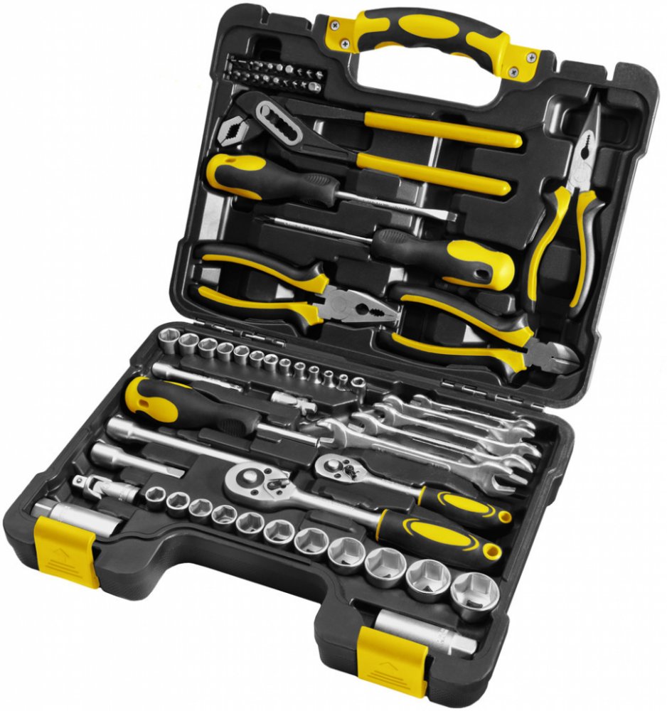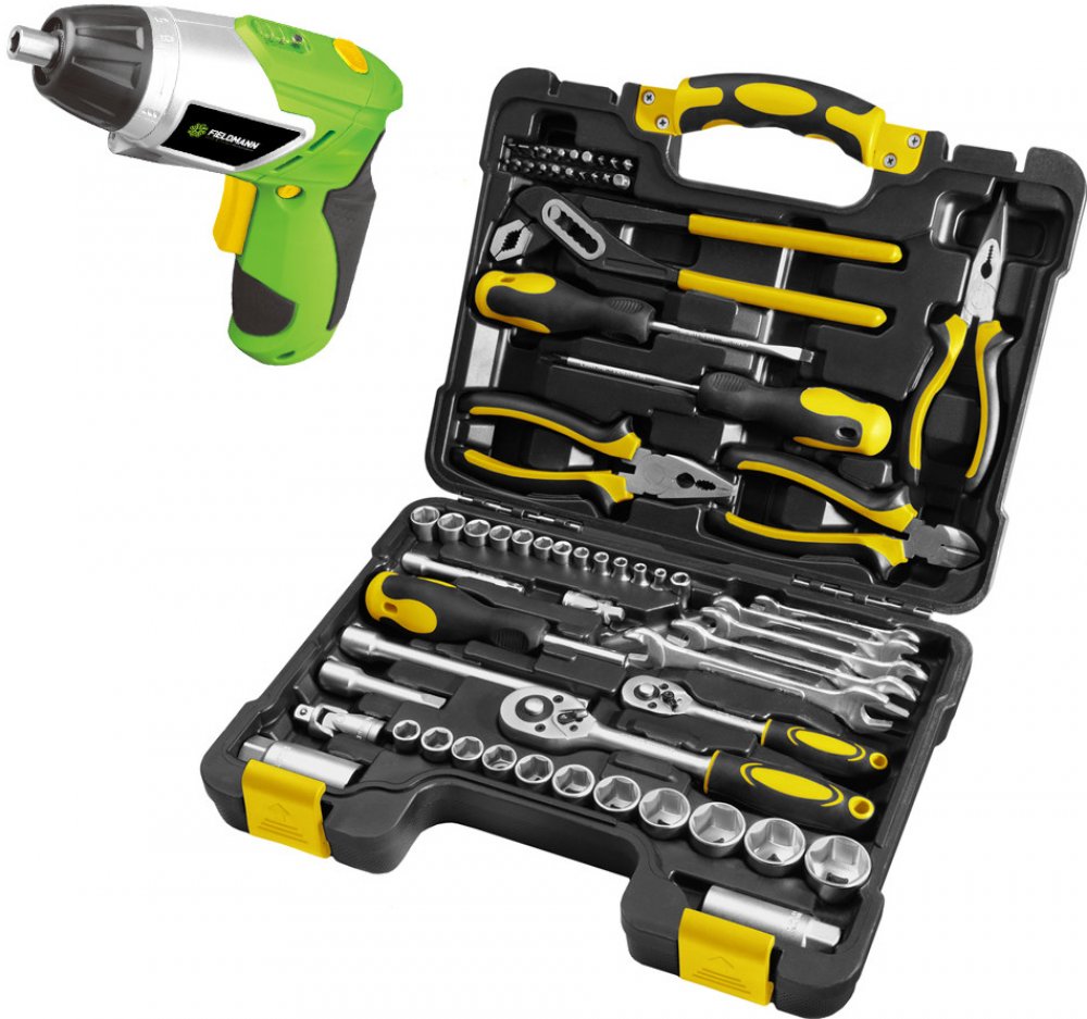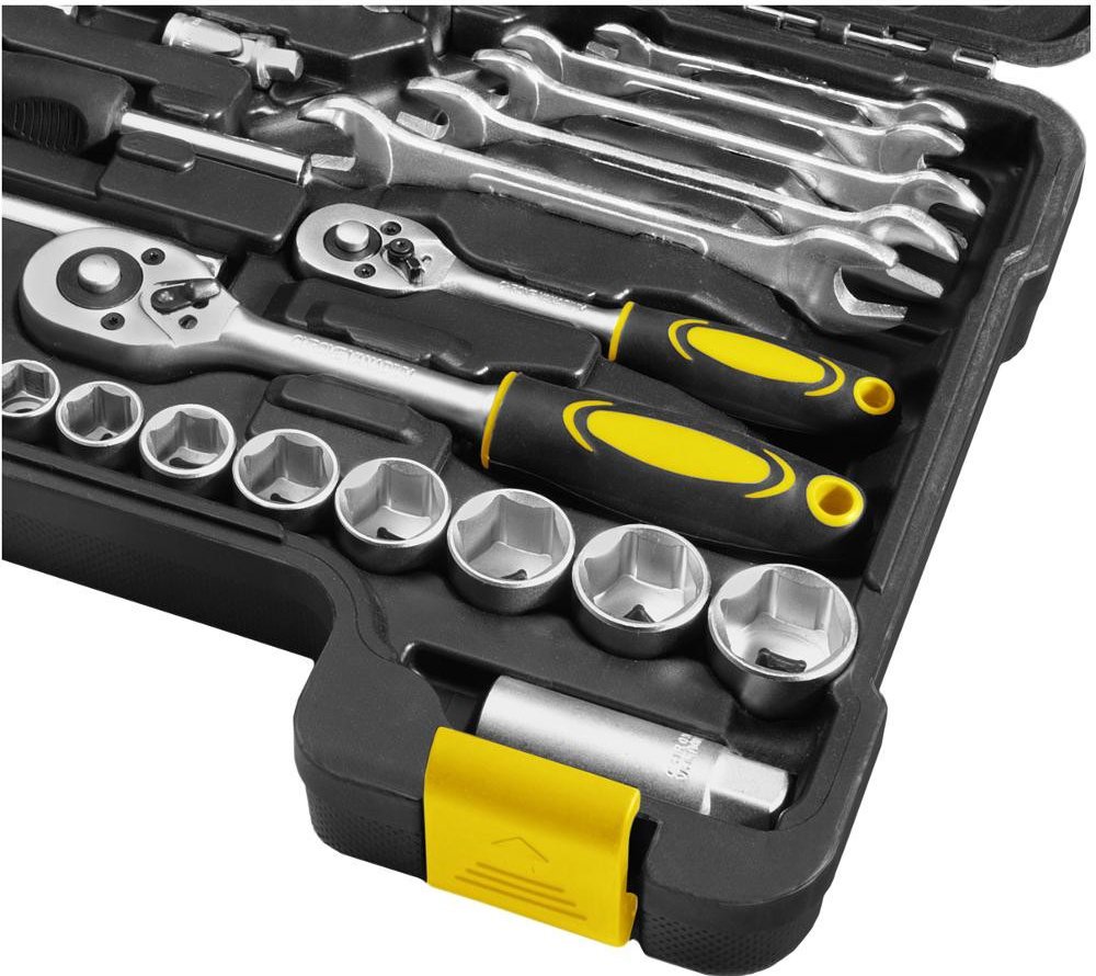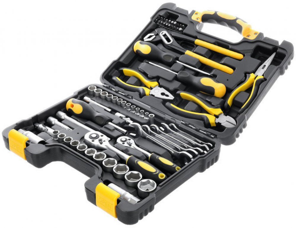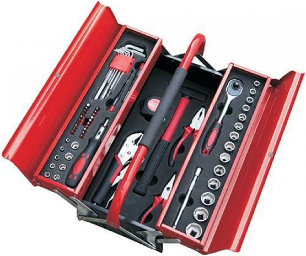 Sada nářadí skládající se z šedesáti pěti dílů s 1/4“ a 3/8“ palcovou ráčnou a nástrčnými hlavicemi od sedmi milimetrů do dvaceti čtyřech milimetrů v CR-V kvalitě. Nedílnou součástí sady jsou kleště diagonální, štípací, dlouhými čelistmi a kleště s posuvným kloubem. V sadě také nechybí sada stranových klíčů a šroubováků. Nářadí je uloženo v pevném plastovém kufříku s ergonomickou rukojetí, jejíž umístění zajišťuje otevření kufříku jen ze správné strany tak, aby se nářadí nevysypalo ven.