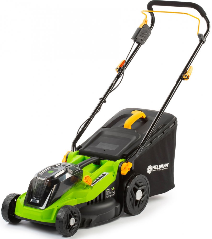 Fieldmann 38 cm plastové 11 kg bez pojezdu akumulátorové rotační 42 l 500 m2 20 V 2 Ah elektromotor 75 mm 5 s plastovo-látkovým košem
