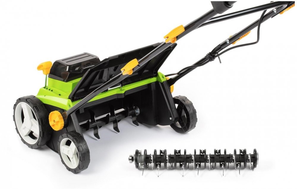 Pokud chcete mít trávník v dobrém stavu, tak jej nestačí pouze sekat a občas pohnojit, ale je vhodné poskytnout mu dodatečnou péči pomocí vertikutátoru, který trávník provzdušní a zbaví ho odumřelých částí či mechu. Pryč jsou doby, kdy bylo možné vybírat pouze mezi nepohodlností prodlužovacího kabelu či zplodin ze spalovacího motoru. Oba problémy vyřeší nejmodernější bezuhlíkový motor našeho AKU vertikutátoru. Stroj disponuje 16 noži při záběru 38cm. Nastavení pracovní hloubky se provádí centrálně v pěti pozicích v rozmezí od -12 do +6 mm. To vše ve spojení s dostatečným výkonem, kterého je dosáhnuto při plném využití síly 2 x 20 V baterií. Samozřejmostí našeho vertikutátoru jsou baterie z programu FAST POWER 20 V, které lze použít do všech strojů naší aku řady. Stroj je dodáván samostatně, bez baterie a nabíječky.