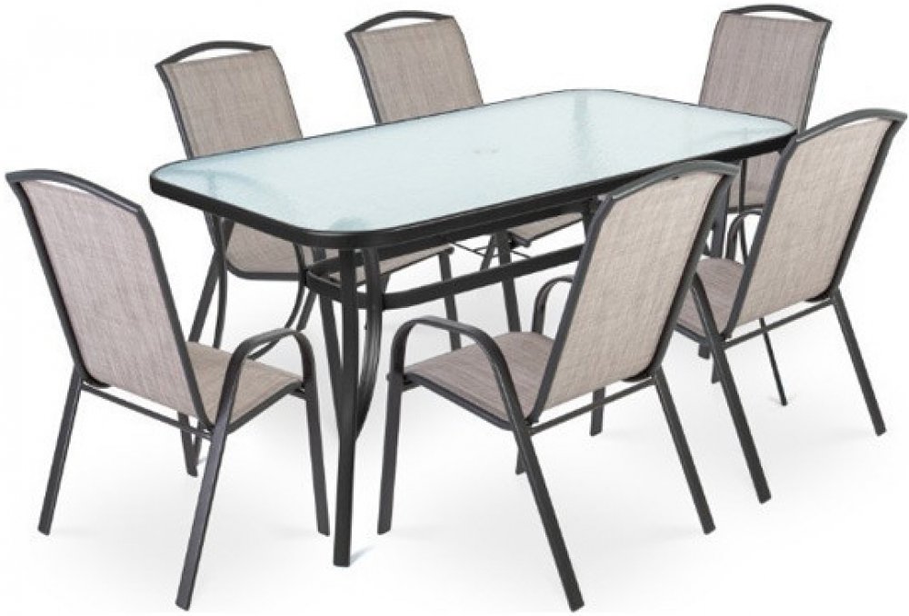 Tato sestava zahrnuje prostorný stůl (150 x 93 x 71 cm) s deskou z čirého tvrzeného skla a šest ergonomicky tvarovaných křesel. Stůl je opatřen otvorem pro umístění slunečníku. Výplň křesel je vyrobena z odolné a pružné syntetické tkaniny, která se ani na přímém sluníčku nerozpálí. Pohodlná křesla mají rozměr 55 x 73 x 94 cm a nosnost až 120 kg. Profily, ze kt...