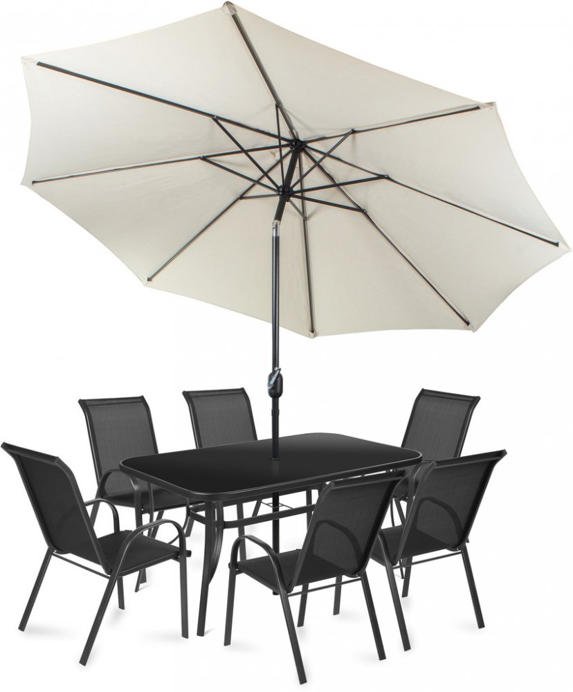 Vysoce elegantní sestava RUBY LIGHT nabídne veškeré pohodlí jak při obědě pod širým nebem, tak při grilovačce nebo jen odpolední kávě. Set zahrnuje prostorný stůl s deskou z černého tvrzeného skla s otvorem pro slunečník, šestici křesílek s výpletem v černé barvě, a navíc slunečník s krémovým potahem. Použitý materiál, ocelovo-hliníkové profily, zajišťuje nábytku nízkou hmotnost vítanou při manipu...