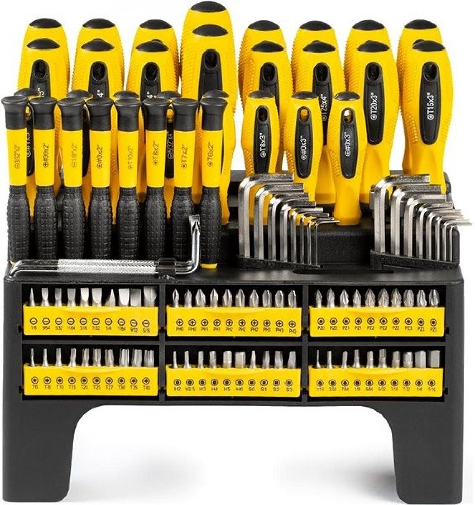 Sada šroubováků FIELDMANN FDS 5009-116R obsahuje 24 šroubováků, 8 precizních šroubováků, 60 bitů, 16 imbusových klíčů, 6 nástrčných hlav a 2 nástavce. Mezi šroubováky nechybí křížové a ploché v různých velikostech. Disponují magnetickými hroty a špičkami. Vyrobené jsou z chrom-vanadové oceli a jejich pohodlné používání zajistí gumové rukojeti. Součástí sady je i praktický stojan, který umožní přeh...