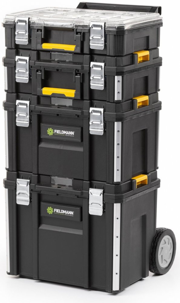Pokud jste zastánci organizovaného pořádku v dílně, nebo si potřebujete uspořádat své ledabyle uložené nářadí, máte možnost pořídit si sadu boxů na nářadí Fieldmann FDN 4170. Praktická sada 4 boxů vám pomůže udělat si ve vašem nářadí pořádek a uspořádat ho tak, že budete mít o vašich věcech přehled a už nebudete muset nic hledat. Spolehnout se můžete na kvalitní materiál boxů, který zajišťuje jejich odolnost vůči nárazům, vodě i prachu. Pro váš komfort je sada opatřena teleskopickou rukojetí a terénními tlumícími koly, takže si můžete nářadí jednoduše převézt tam, kde ho budete potřebovat a mít ho kdekoli po ruce.Na veškeré vaše nářadí máte v boxech dostatek místa. V největším spodním boxu máte prostor o rozměrech 55 × 47 × 68 cm, střední boxy mají rozměry 51 × 36 × 31 cm a 51 × 36 × 18 cm a nejmenší horní má kompaktní rozměry 51 × 36 × 14 cm. Horní box disponuje transparentním víkem a organizérem s 12 přihrádkami pro větší přehlednost. Všechny boxy lze snadno uzavřít kovovým zámkem.Jednotlivé části v sadě:FDN 4171 Box spodní částFDN 4172 Box střední velká částFDN 4173 Box střední malá část FDN 4174 Box horní část