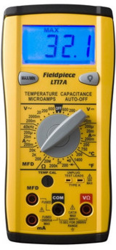 Multimetr / LT17A / digitálníLT17A je klasický digitální multimetr, určený pro techniky HVACR. Měřič dokáže měřit teploty až do 760ºC. Testovací vodiče jsou uloženy v těle měřiče a lze je připojit k libovolné hlavici Fieldpiece bez hrotu sondy.Tento digitální multimetr má mnoho rozsahů a je odolný, ideální pro jakékoli pracoviště. Tělo měřiče je vyrobeno z odolného ABS plastu a je dodáváno s jasně modrým podsvícením, aby bylo zajištěno, že měření uvidíte všude.Technické informace:Automatické vypnutí: vypnutí po 25 minutách pro prodloužení baterie.Indikátory: Zvukový signál kontinuity (