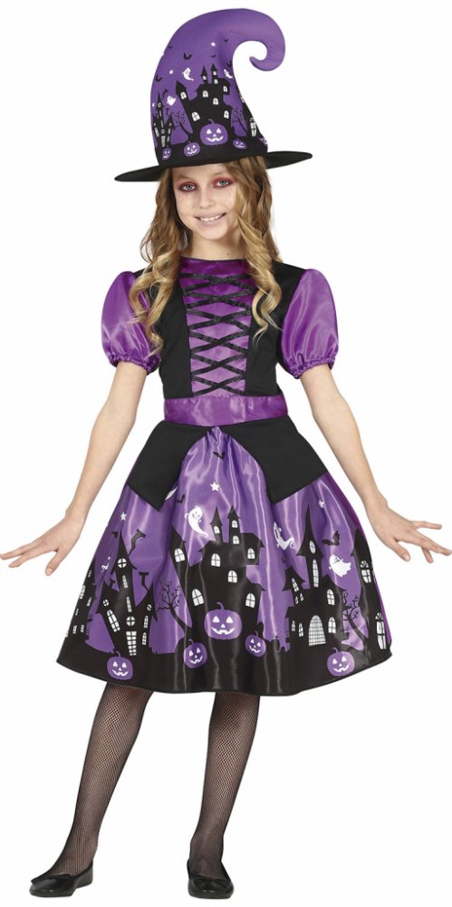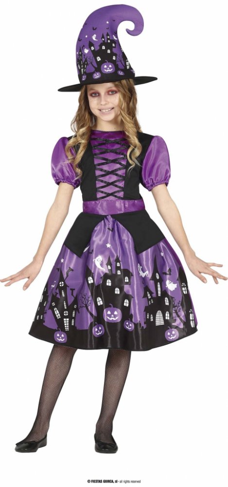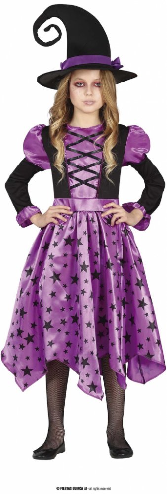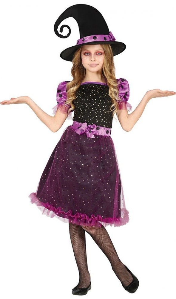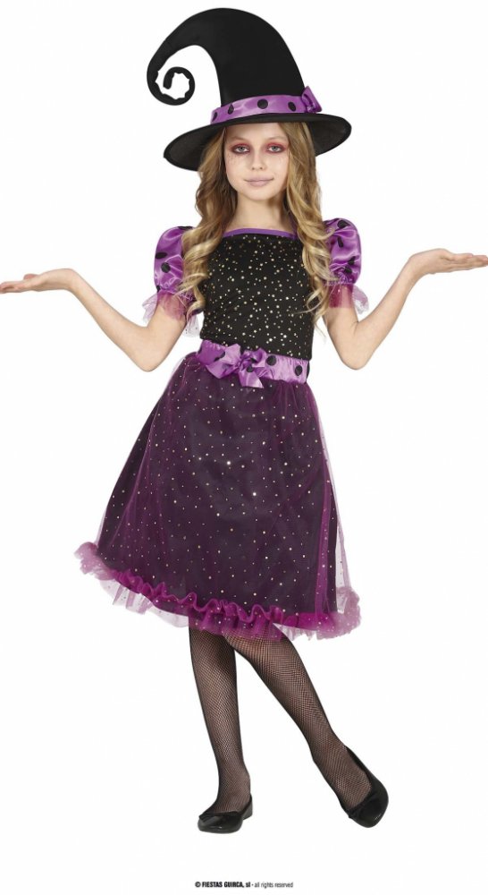 FIESTAS GUIRCA Třpytivý fialový maškarní kostým čarodějnice – šaty s třpytkami a čarodějnickým kloboukem pro dívky 10-12 let FIESTAS GUIRCA Třpytivý fialový maškarní kostým čarodějnice – šaty s třpytkami a čarodějnickým kloboukem pro dívky 10-12 let