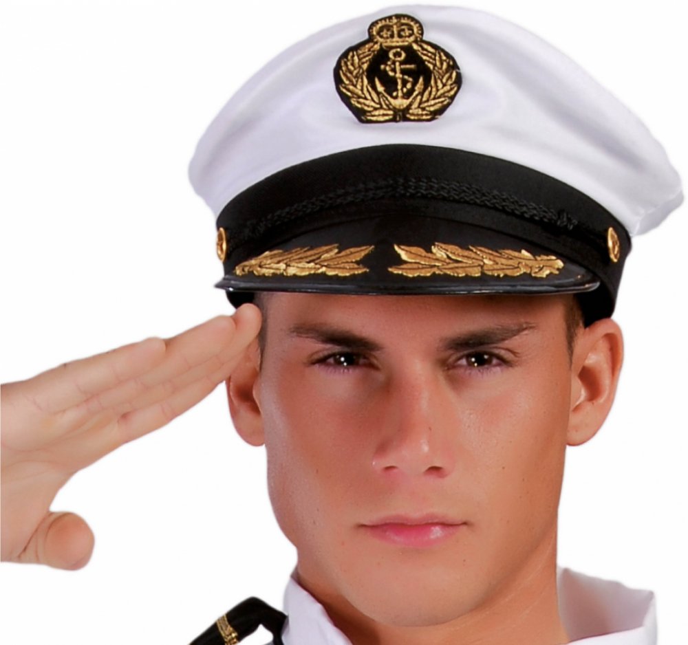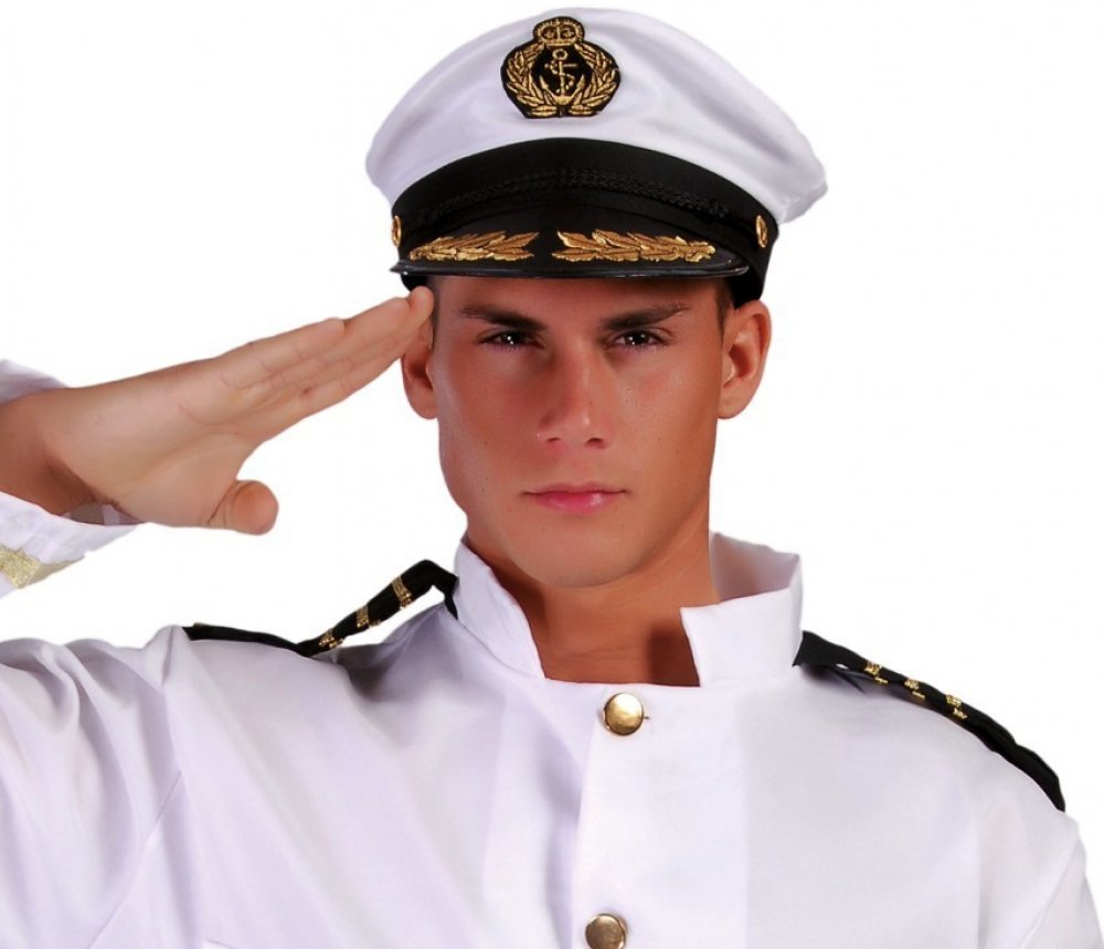 Párty čepice námořnická Kapitán bílá s černým kšiltem a zlatými doplňky, materiál polyester, jednotná velikost.