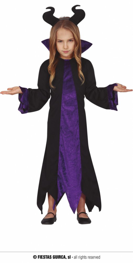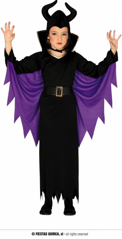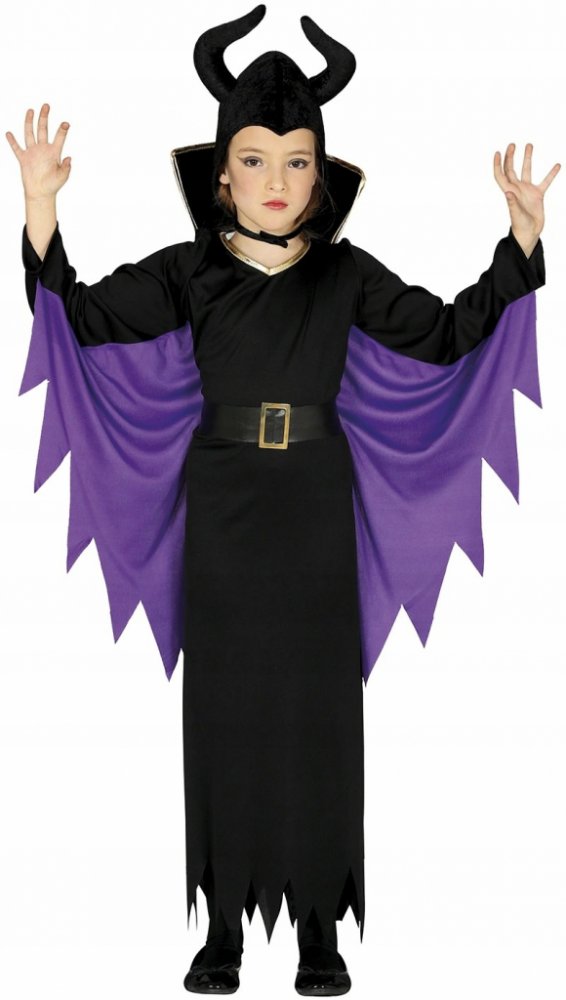 Dětský kostým Zloba obsahuje dlouhé černé šaty s dlouhými rukávy a čepici.