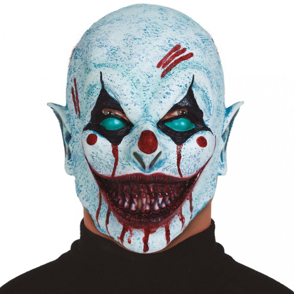 Navlékací latexová maska na hlavu Klaun v bílo-modré barvě s krvavými zuby.
