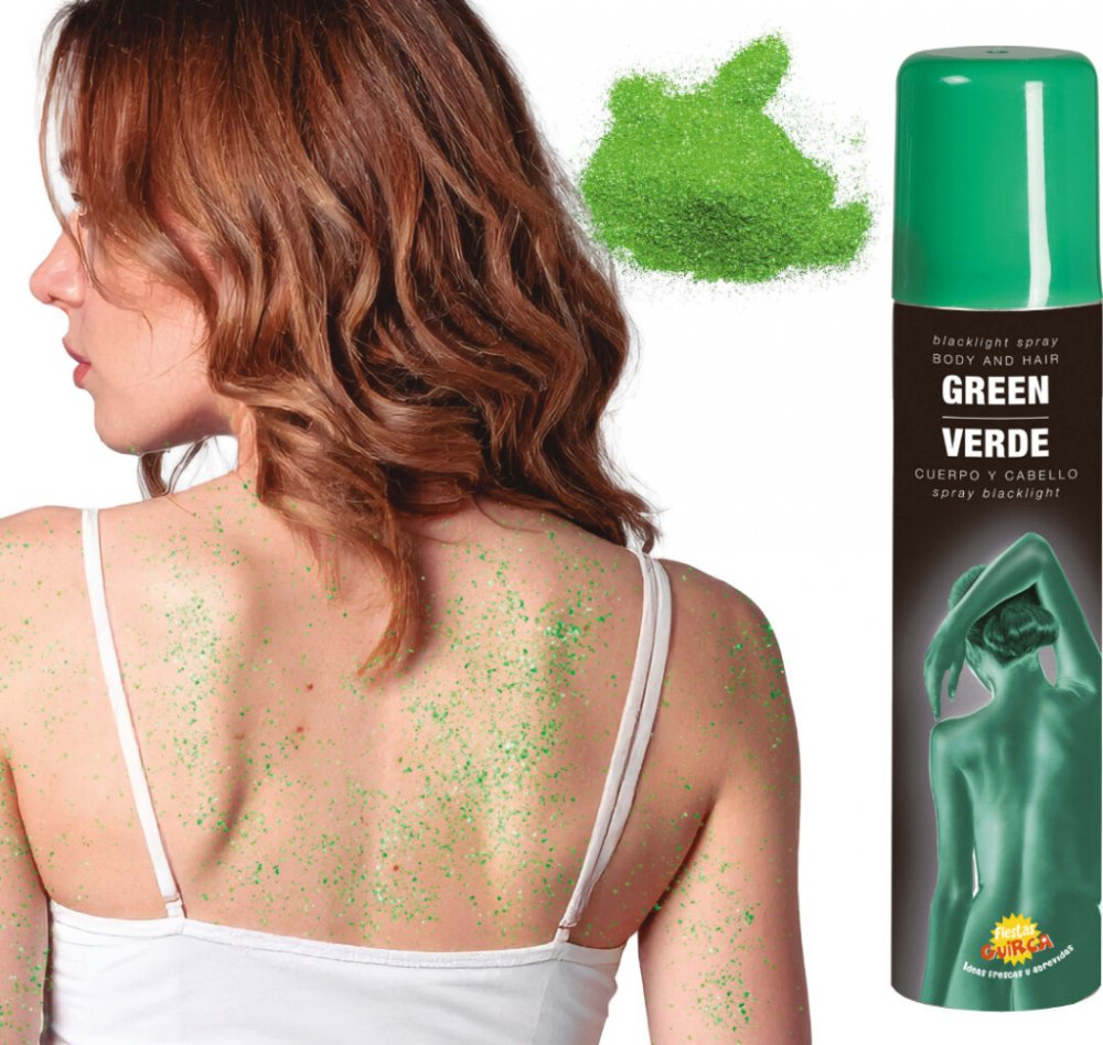 Párty sprej barva na tělo a vlasy zelená, obsah 75 ml. Pro větší intenzitu barvy naneste druhou vrstvu, až první zaschne.